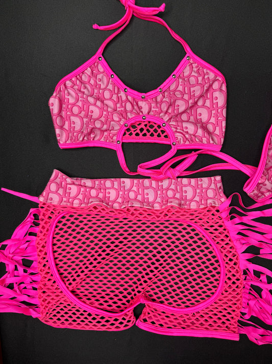 Pink Microdot Spandex Bikini Top/Mesh Shorts Two-Piece Lingerie Outfit