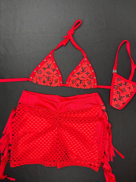 Red Designer Bikini Top/Fringe Shorts Two-Piece Lingerie Outfit