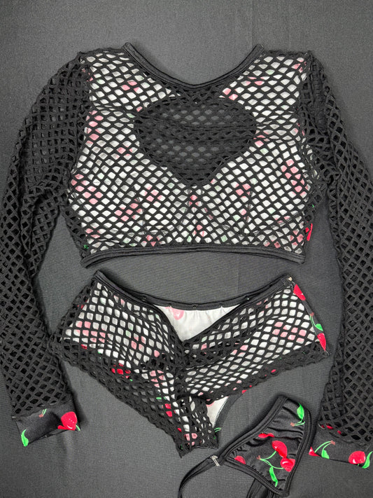 Red Cherry/Black Spandex/Fishnet Two-Piece Long Sleeve/Shorts Lingerie Outfit