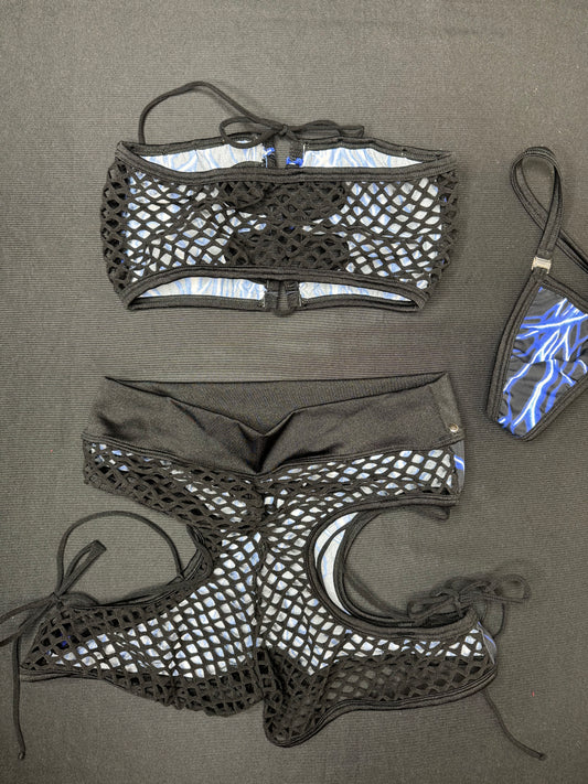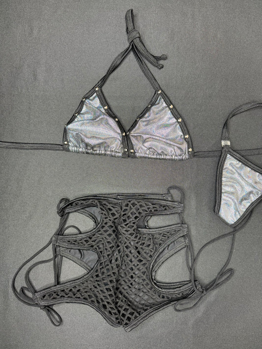 Metallic Black/Black Fishnet Bikini Top/Shorts Two-Piece Lingerie Outfit