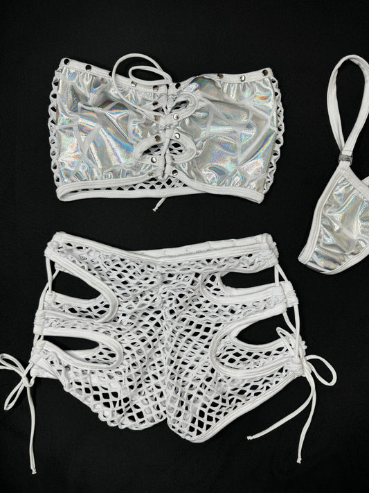 Silver/White Fishnet Fringe/Shorts Two-Piece Lingerie Outfit