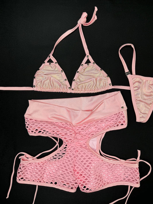 Metallic Pink/Pink Bikini Top/Shorts Two-Piece Lingerie Outfit