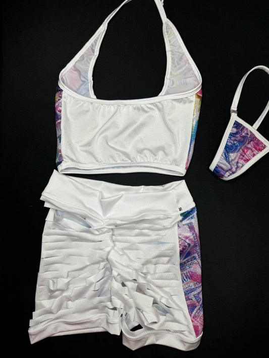 Holographic Money Print Two-Piece Sports Bra/Ripped Shorts Lingerie Outfit
