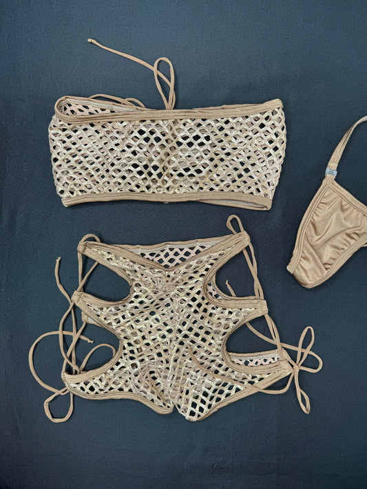 Gold Fishnet/Beige Tube Top/Shorts Two-Piece Lingerie Outfit