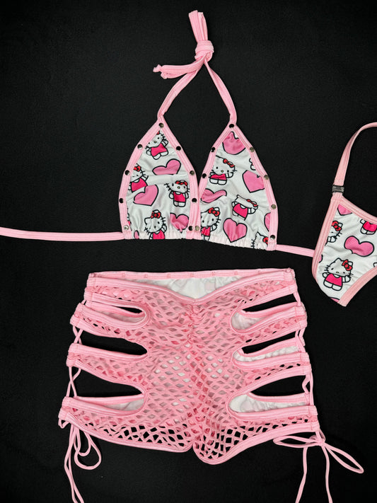 Baby Pink/White Kitty Bikini/Shorts Two-Piece Lingerie Outfit