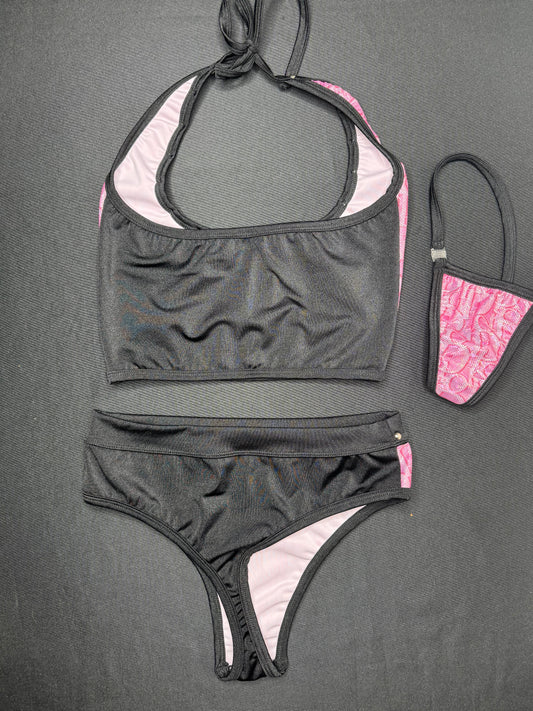 Metallic Pink Designer/Black Spandex Two-Piece Shorts Lingerie Outfit