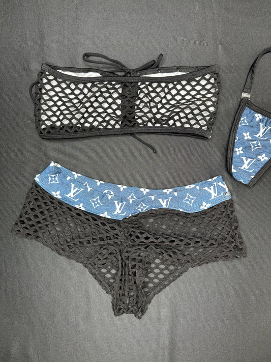 Designer Denim/Black Fishnet Tube Top/Shorts Two-Piece Lingerie Outfit