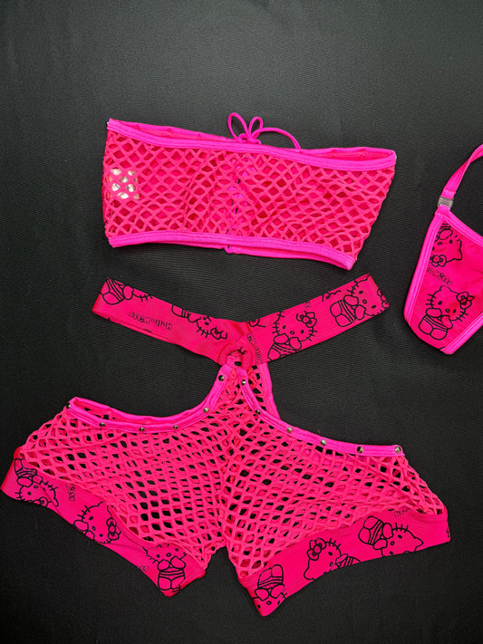 Hot Pink Fishnet Kitty Tube Top/Shorts Two-Piece Lingerie Outfit