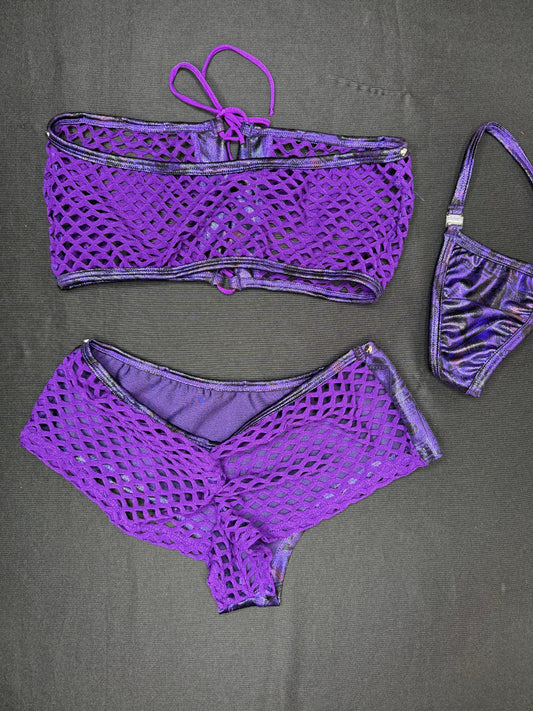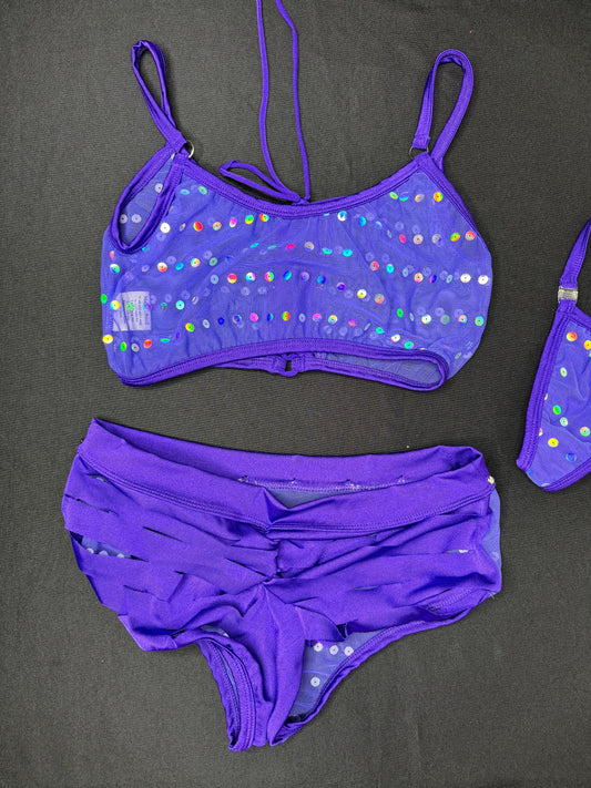 Purple Mesh Sports Bras/Shorts Ripped Back Two-Piece Lingerie Outfit