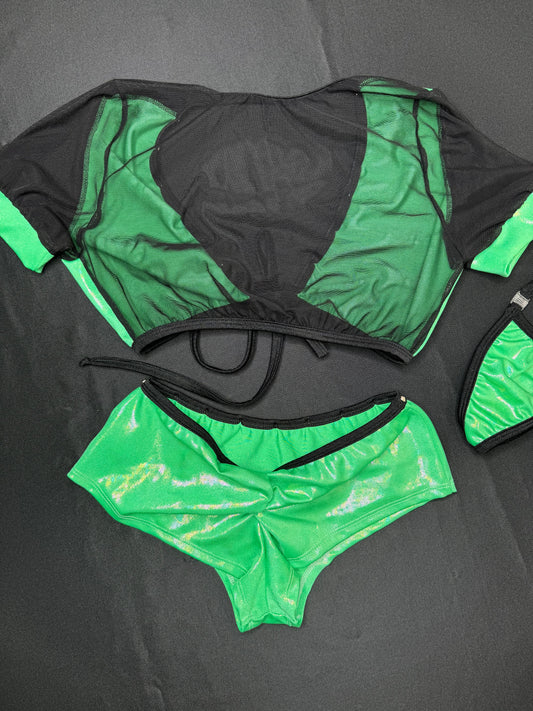 Mystic Green Spandex/Black Mesh Two-Piece Shorts Lingerie Outfit