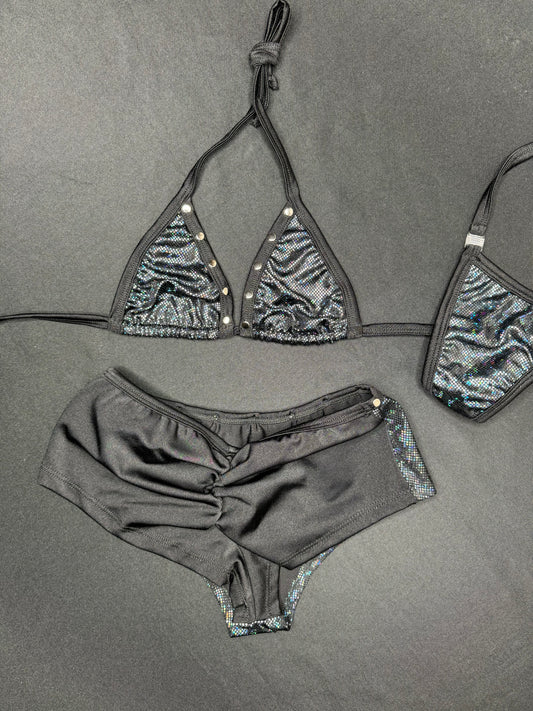 Metallic Black Bikini Top/Shorts Two-Piece Lingerie Outfit