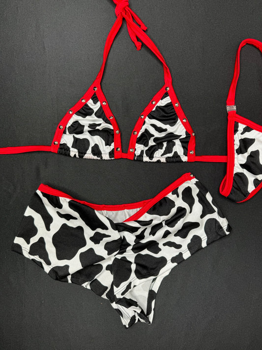 Red/White Cow Print Two-Piece Bikini Top/Shorts Lingerie Outfit
