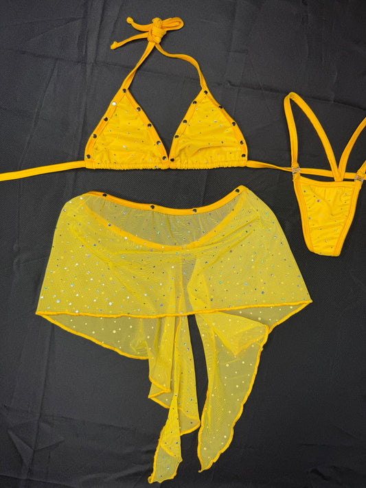 Yellow Mesh Bikini Top/Skirt Two-Piece Lingerie Outfit