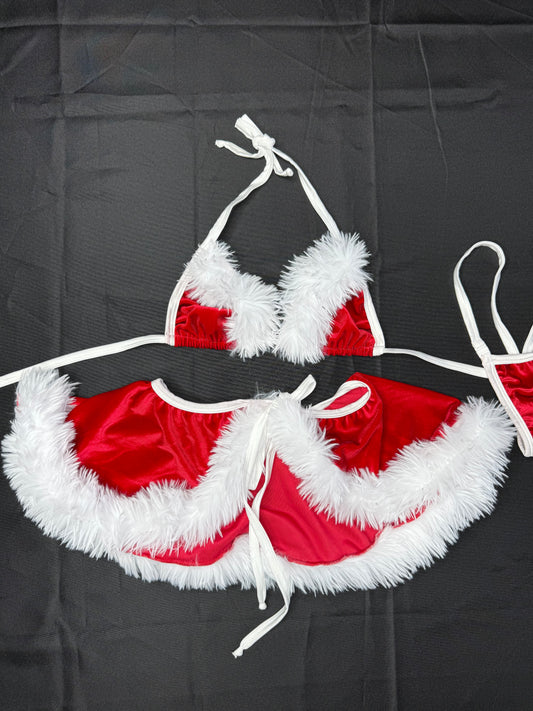 Red Plaid Fur Bikini Top/Skirt Two-Piece Lingerie Outfit
