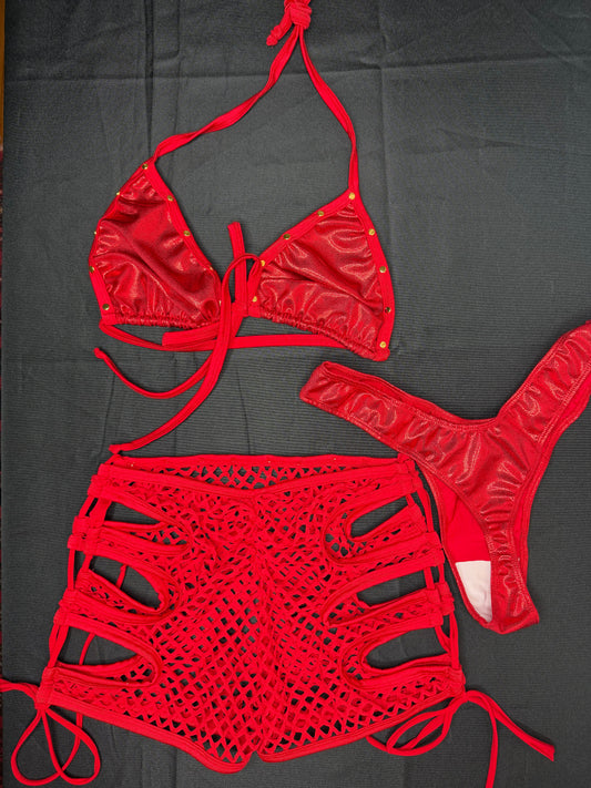 Metallic Red Spandex Three-Piece Bikini/Shorts/Cheeky Thong Lingerie Outfit