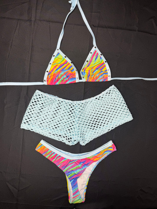 Rainbow Stripes Bikini Top/Cheeky Thong Baby Blue Fishnet Shorts Three-Piece Lingerie Outfit