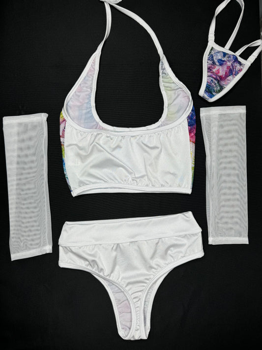 Metallic Silver/Gold Designer Three-Piece White Fishnet Arm Sleeve Lingerie Outfit