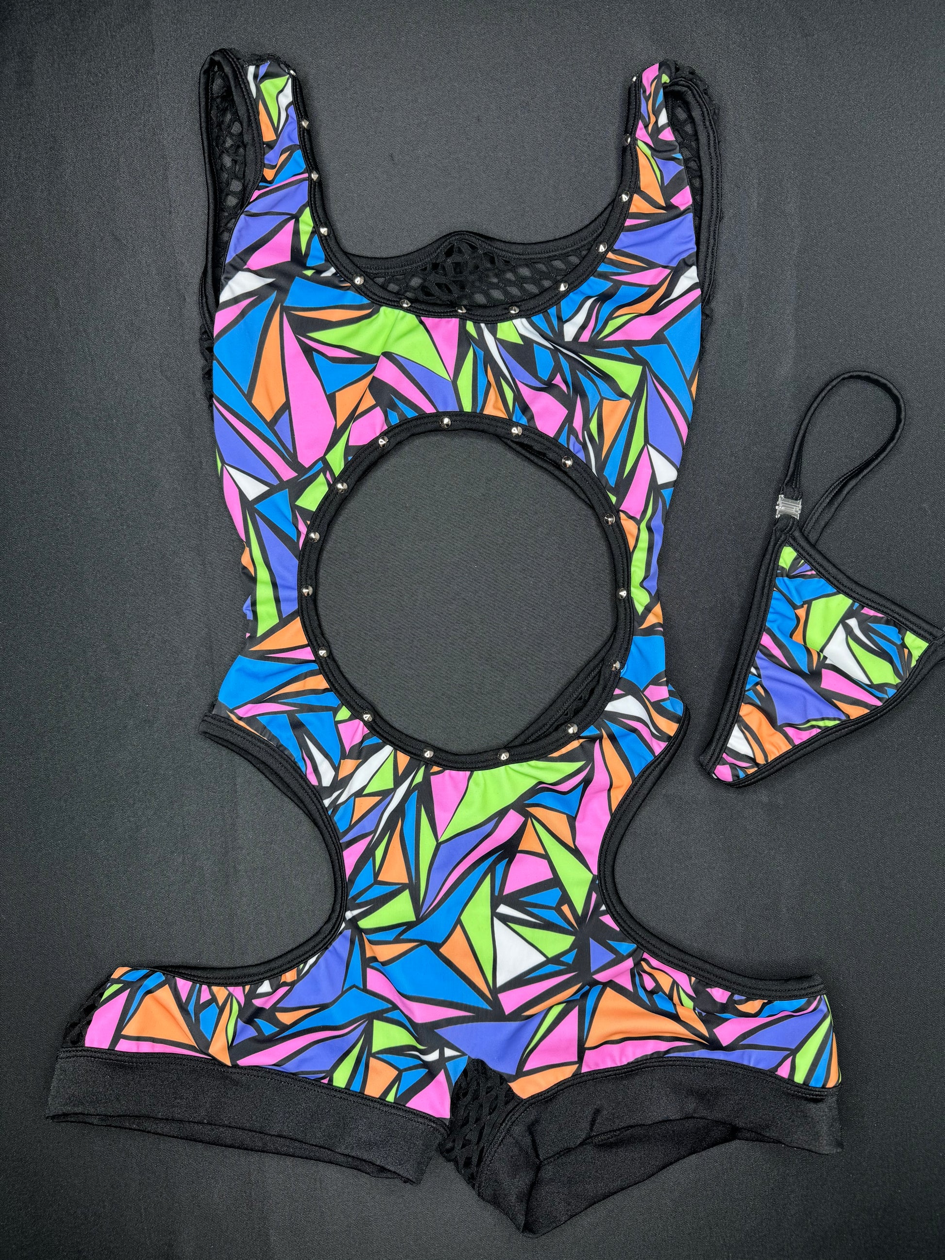 Abstract Multi Color/Black Fishnet Sleeveless Lingerie Romper
