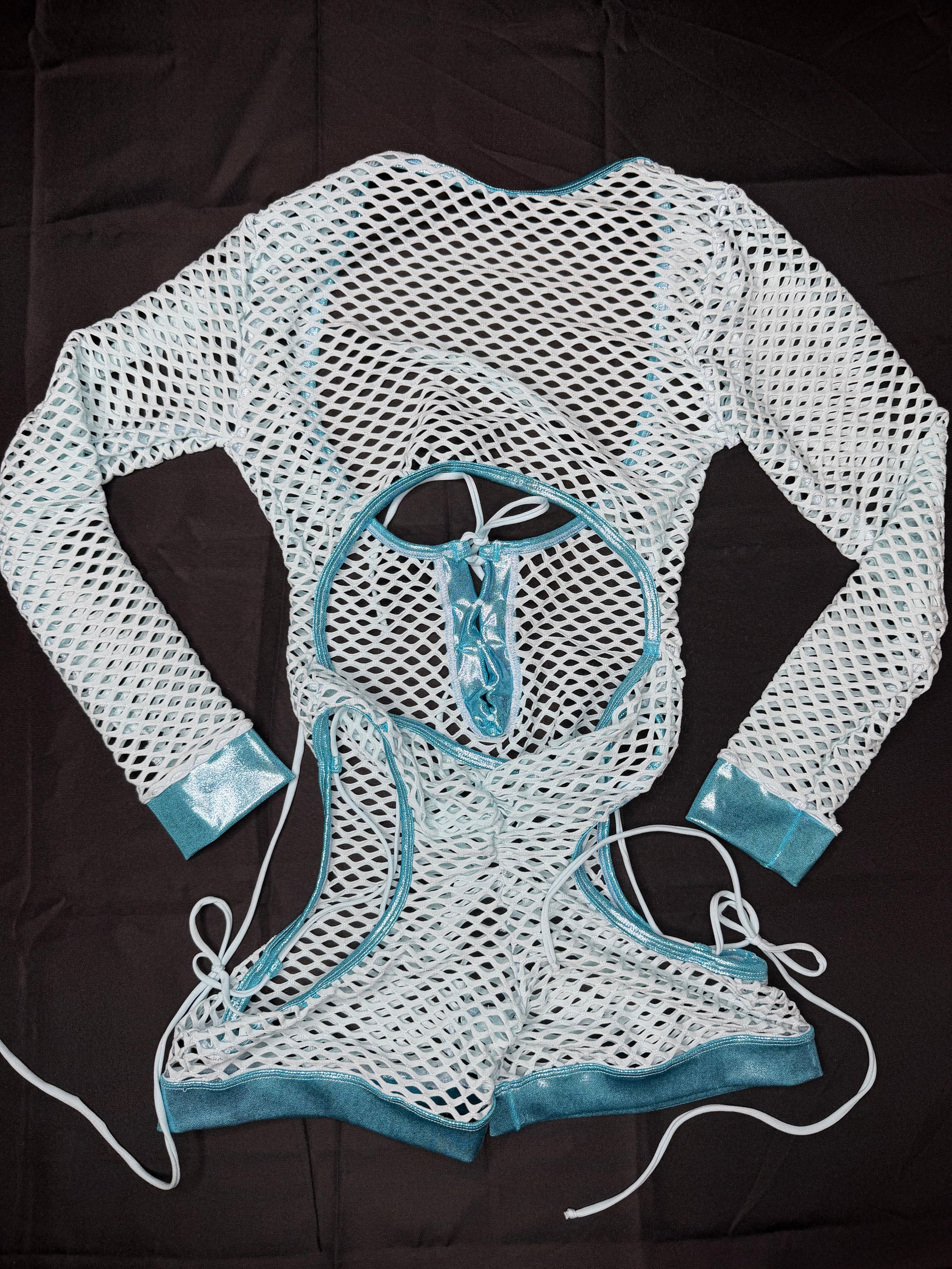 Baby Blue Spandex/Fishnet Romper Long Sleeve Lingerie Outfit