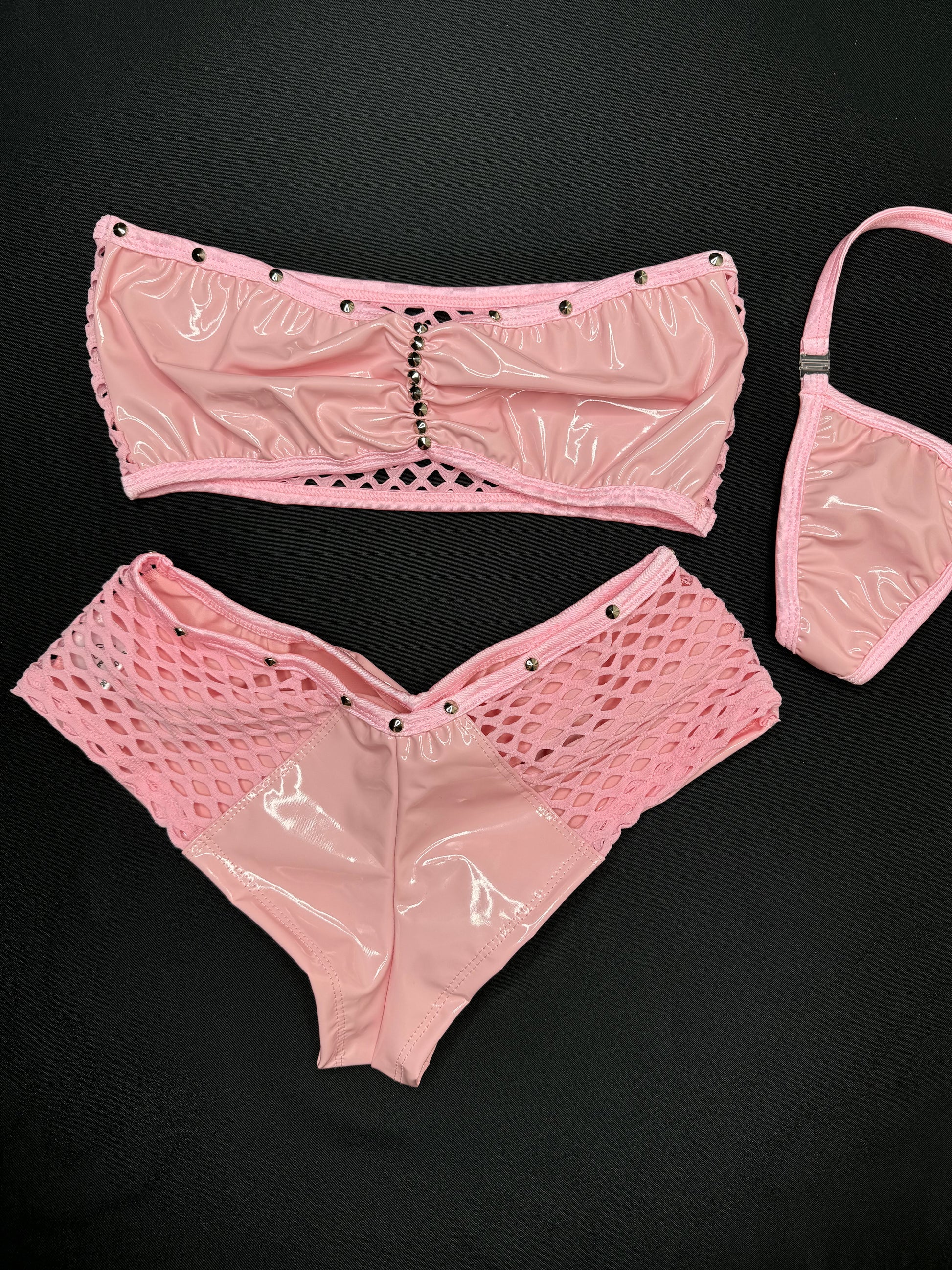 Baby Pink Latex/Fishnet Tube Top/Shorts Two-Piece Lingerie Outfit