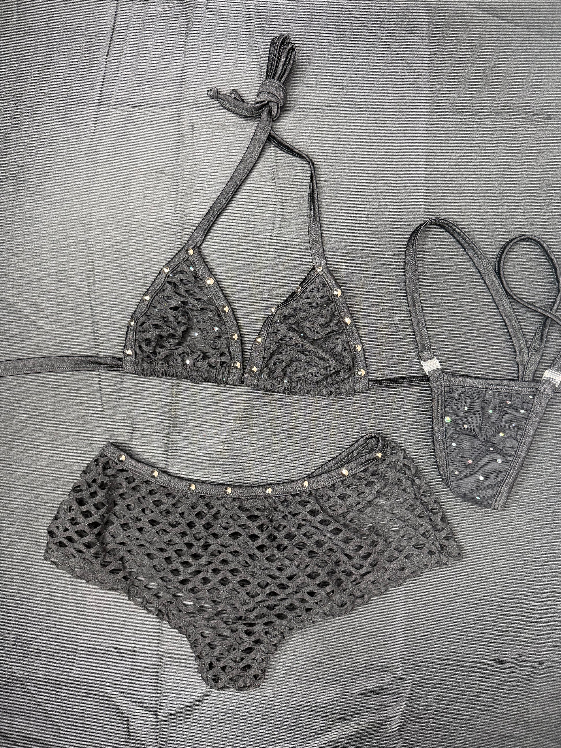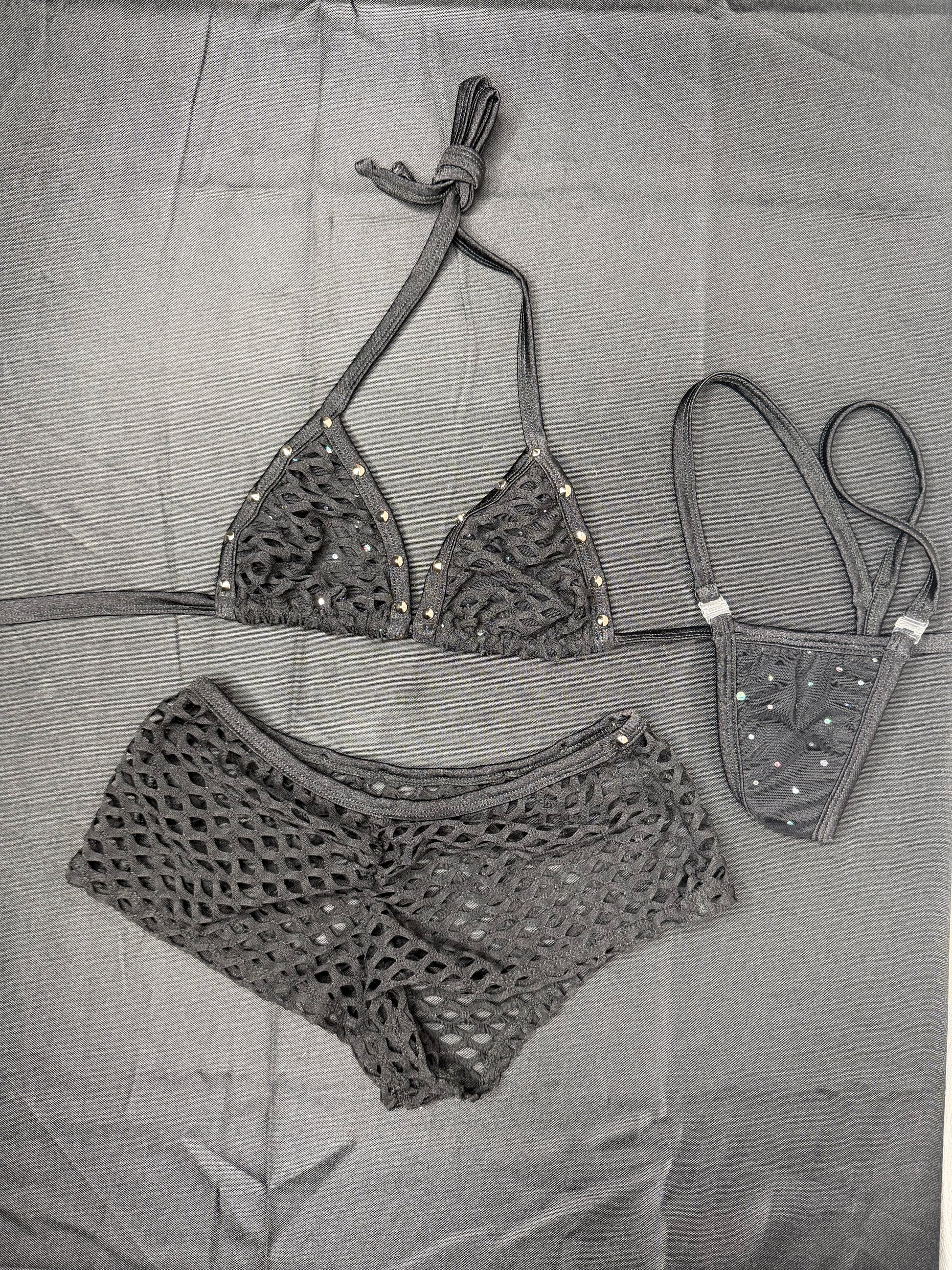 Black Fishnet Spandex Bikini Top/Shorts Two-Piece Lingerie Outfit