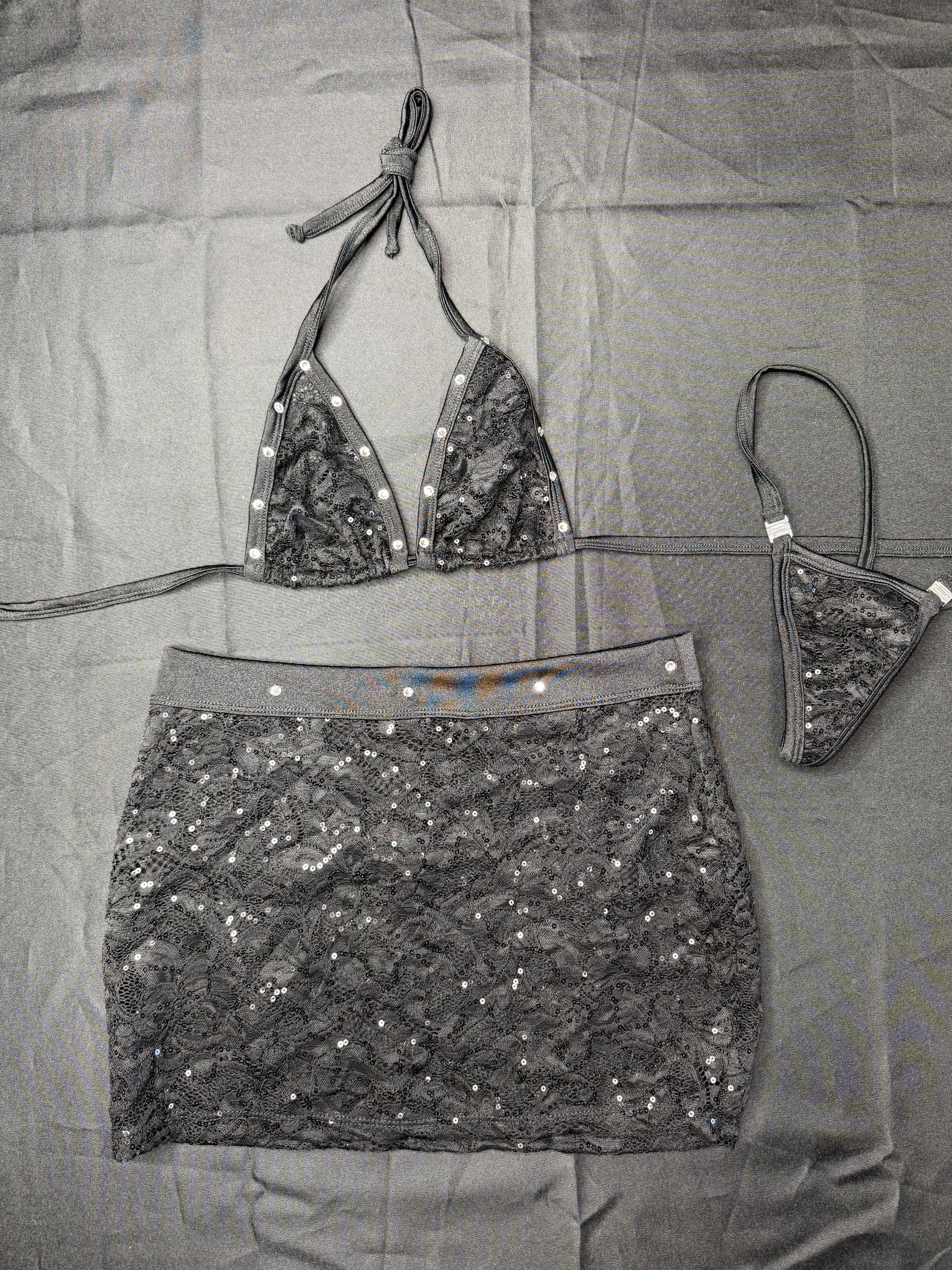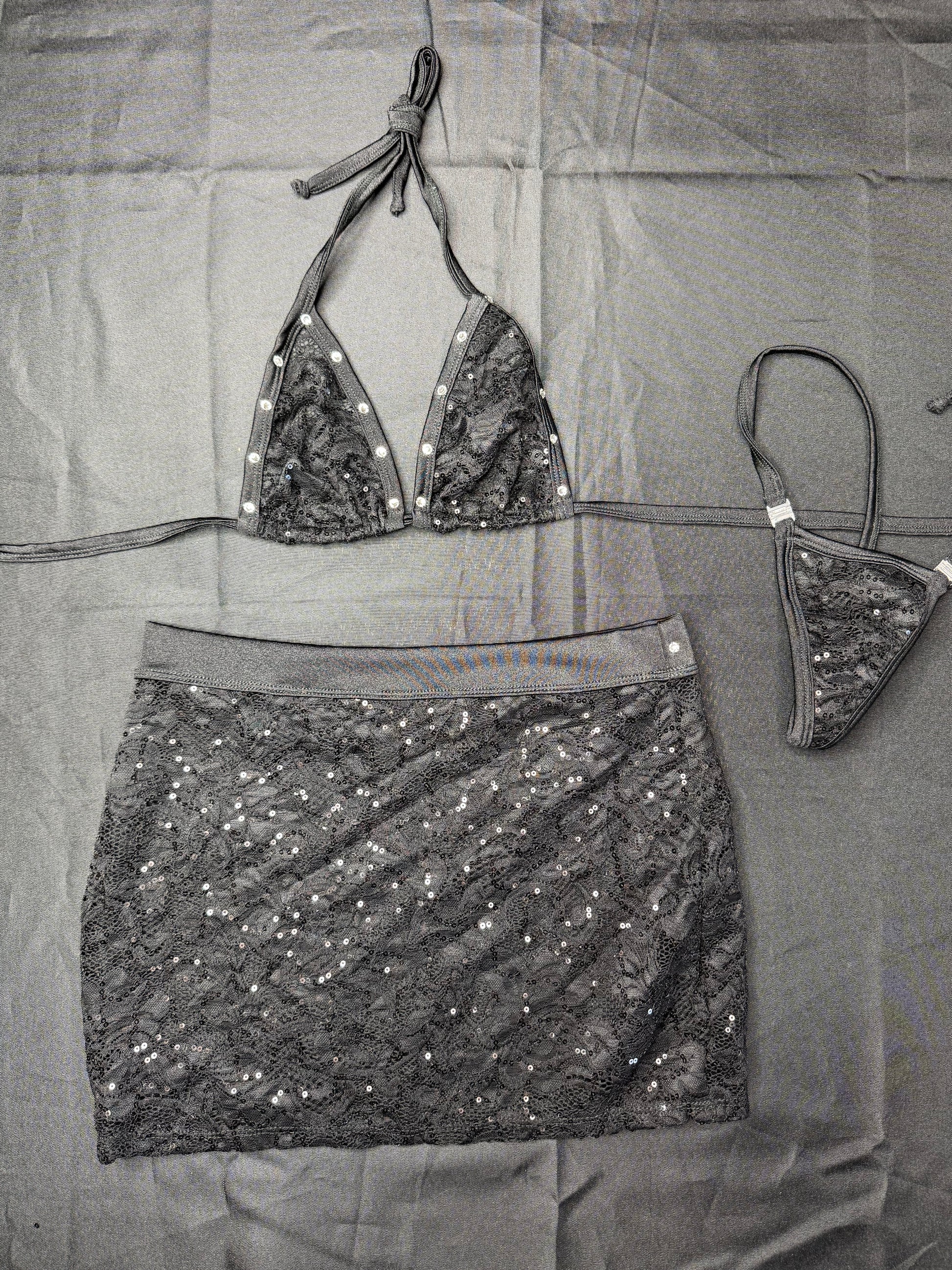 Black Sequence Lace/Spandex Two-Piece Skirt Lingerie Outfit