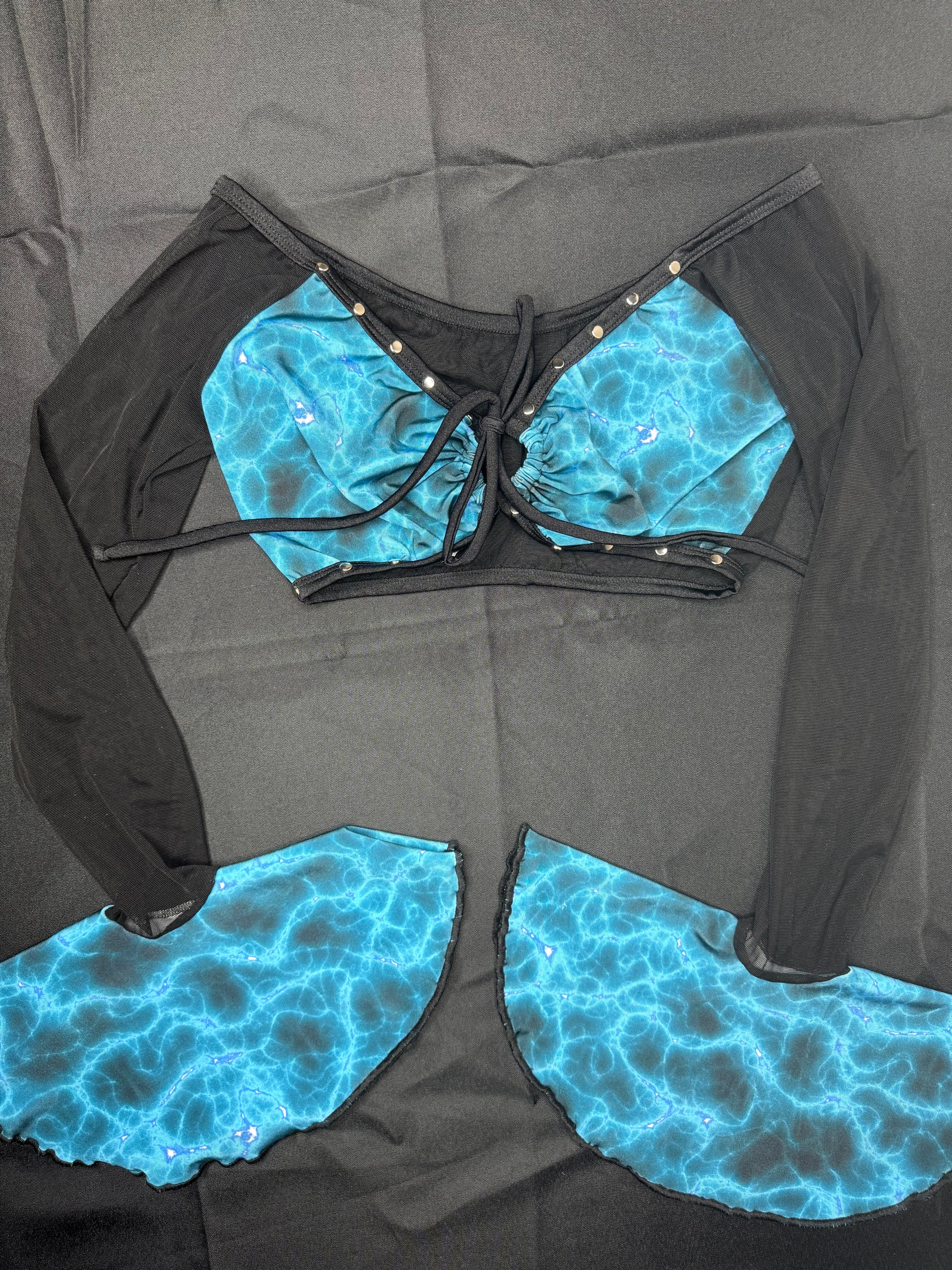Blue Spandex/Black Mesh Long Sleeve Two-Piece Silicone String Bottoms Lingerie Outfit