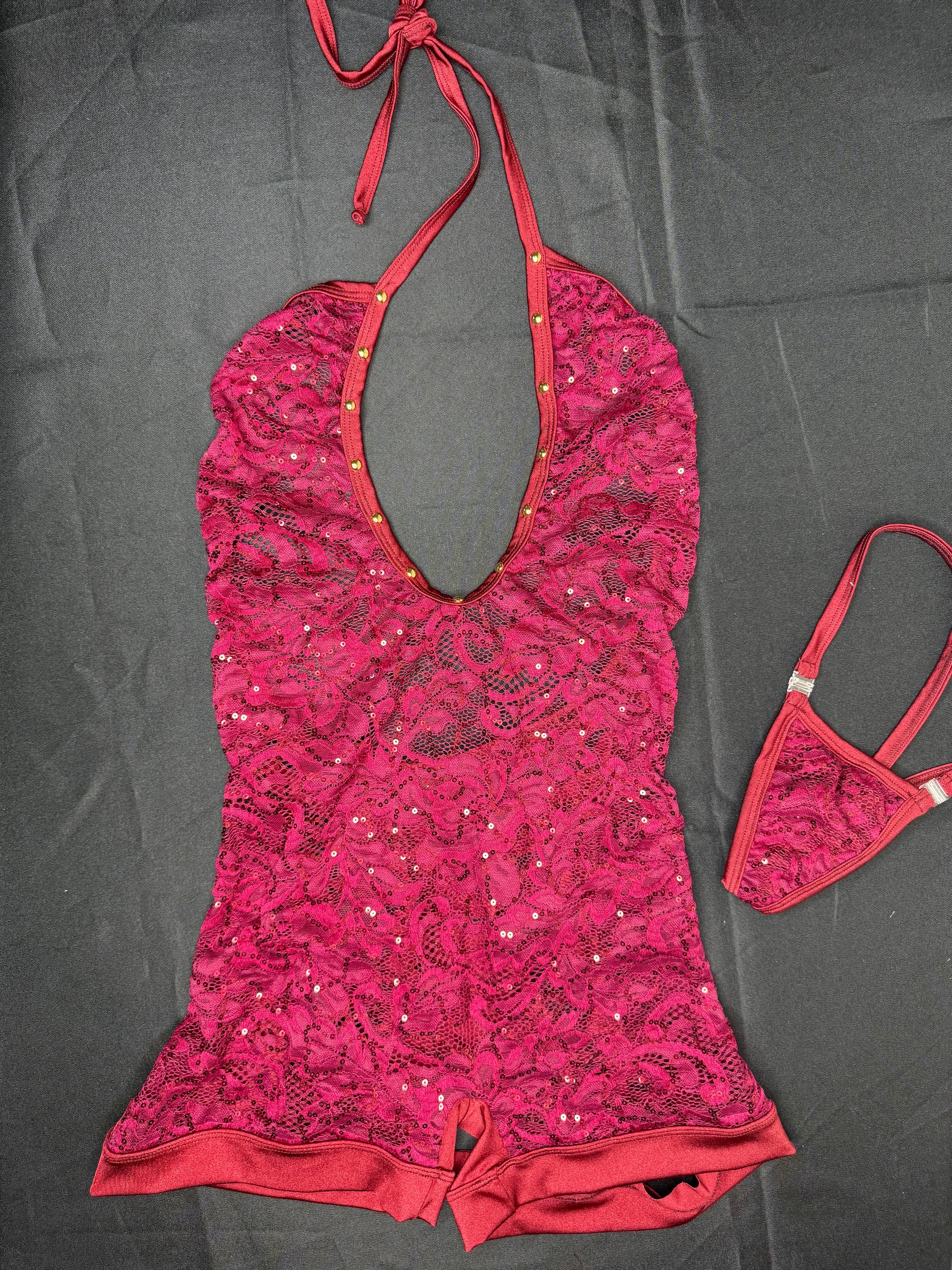Burgundy Sequins Lace Ripped Back One-Piece Lingerie Outfit
