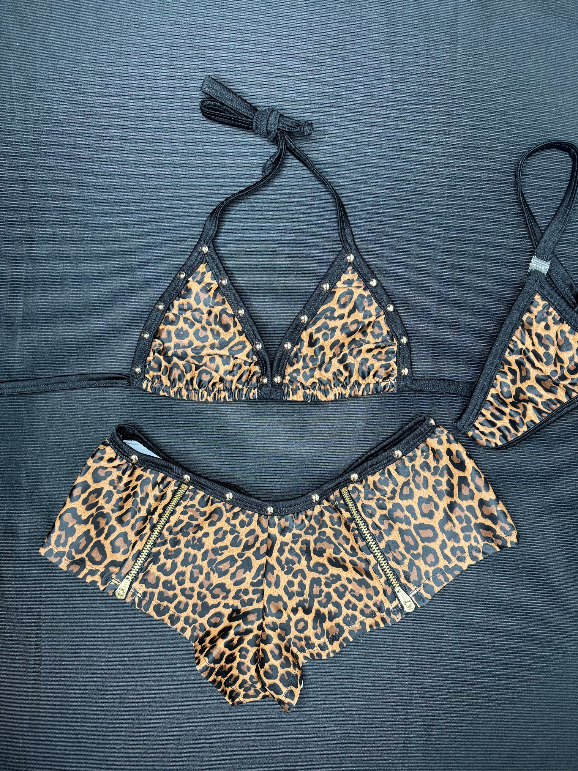 Cheetah Animal Print Bikini Top/Zipper Shorts Two-Piece Lingerie Outfit