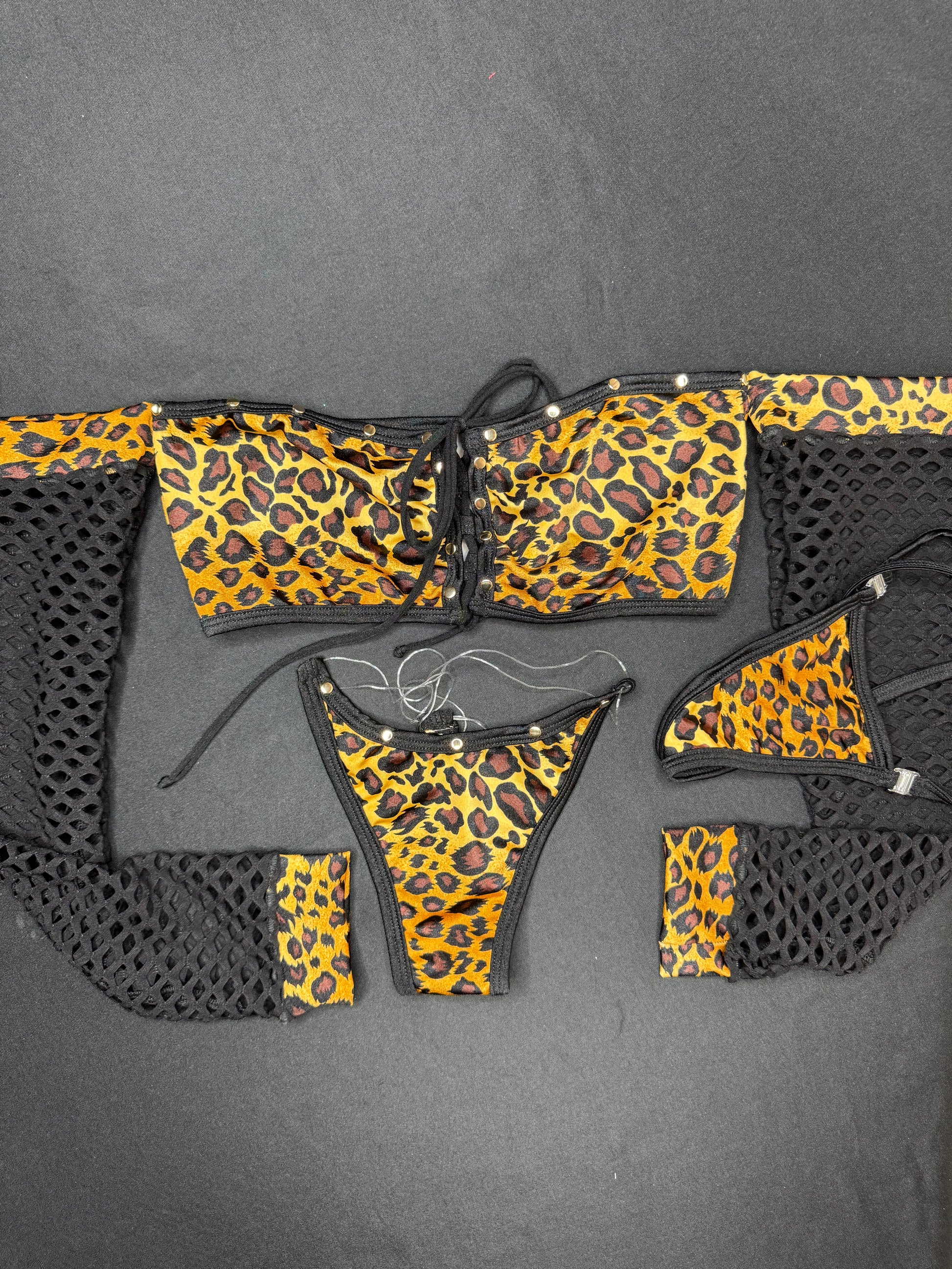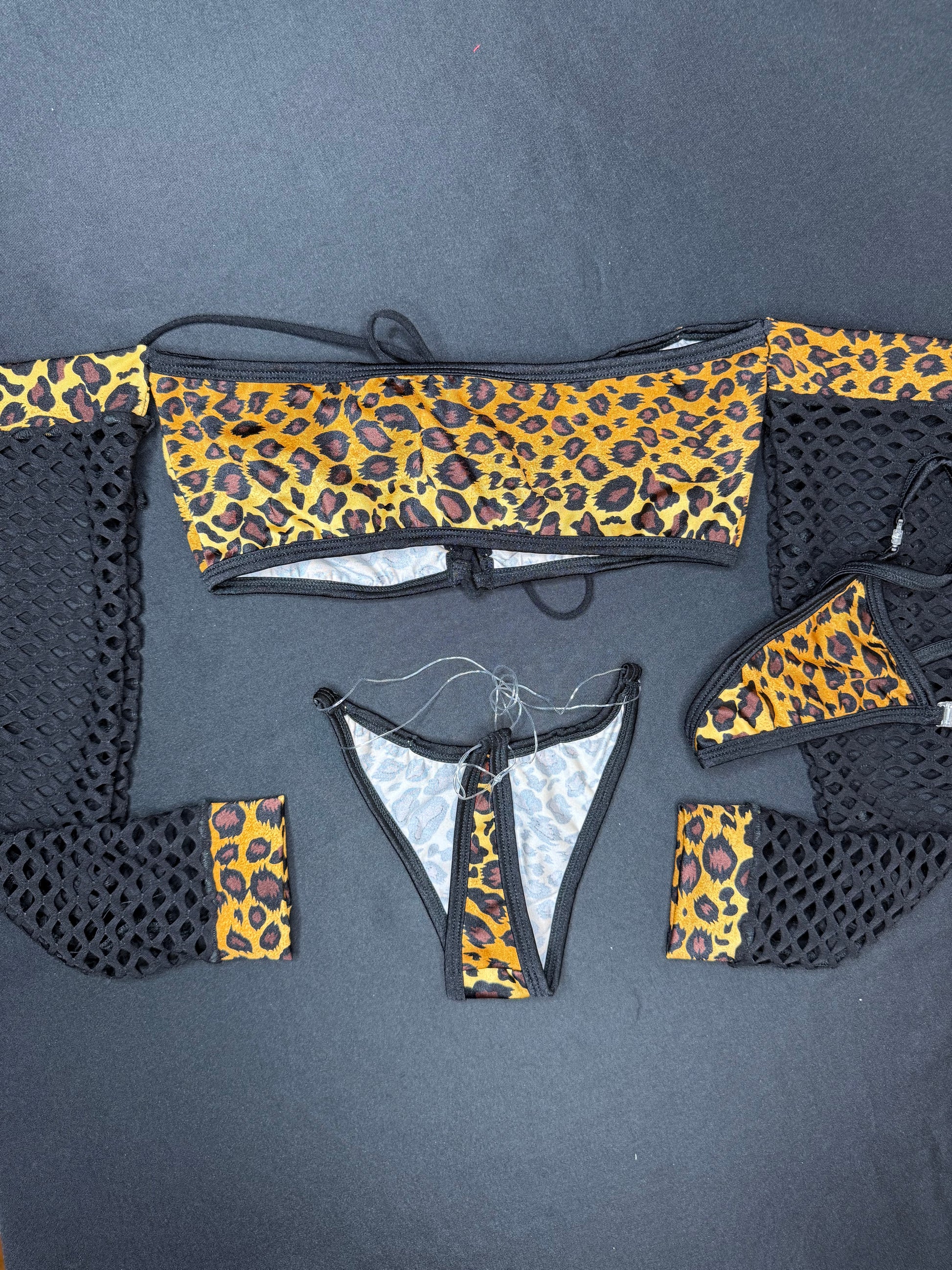 Cheetah Animal Print Black Long Sleeve Fishnet Spandex/Silicone String Bottoms Two-Piece Lingerie Outfit