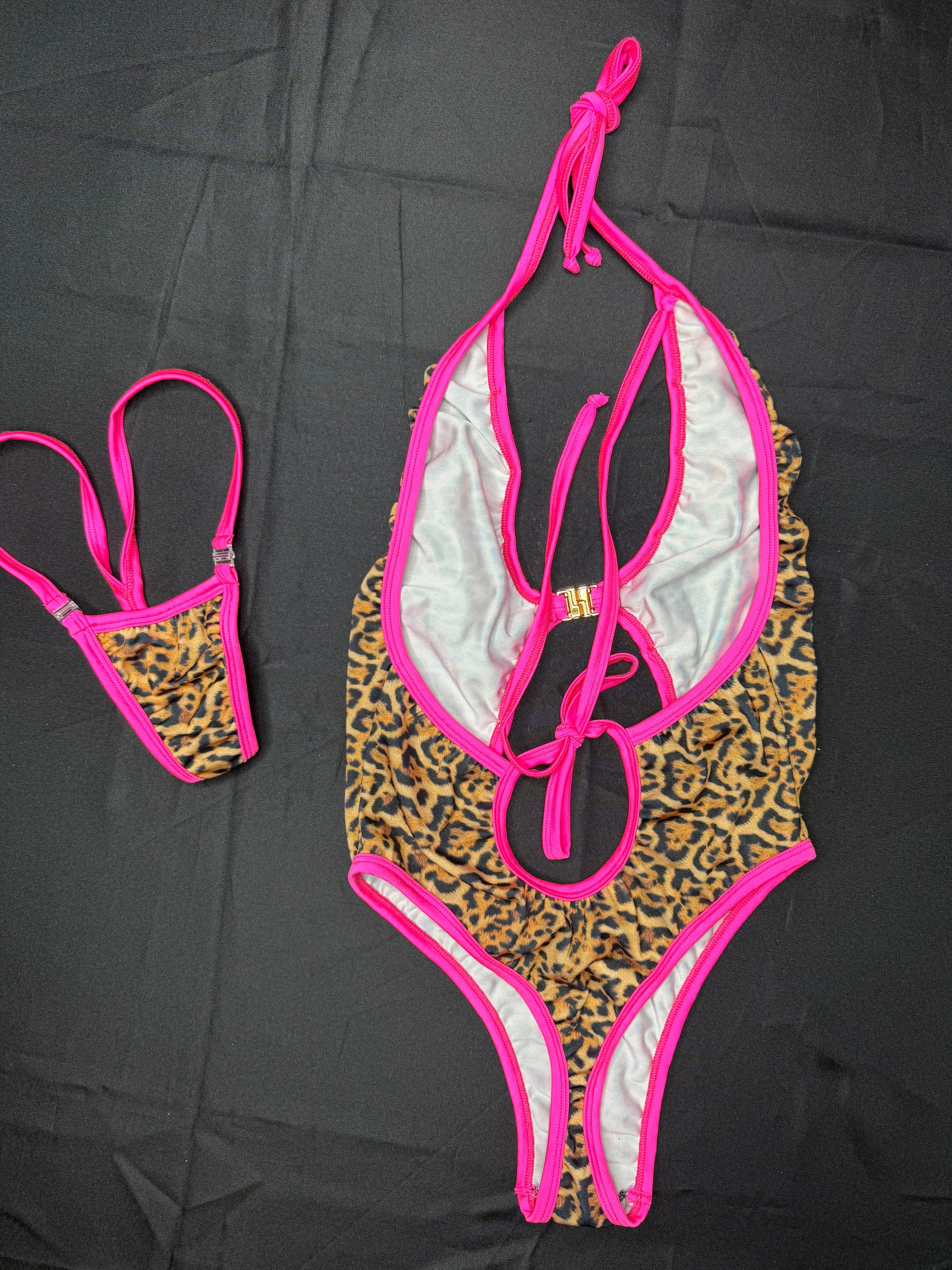 Cheetah Print/Hot Pink Fishnet Spandex One-Piece Hot Pink Fishnet Shorts Three-Piece Lingerie Outfit