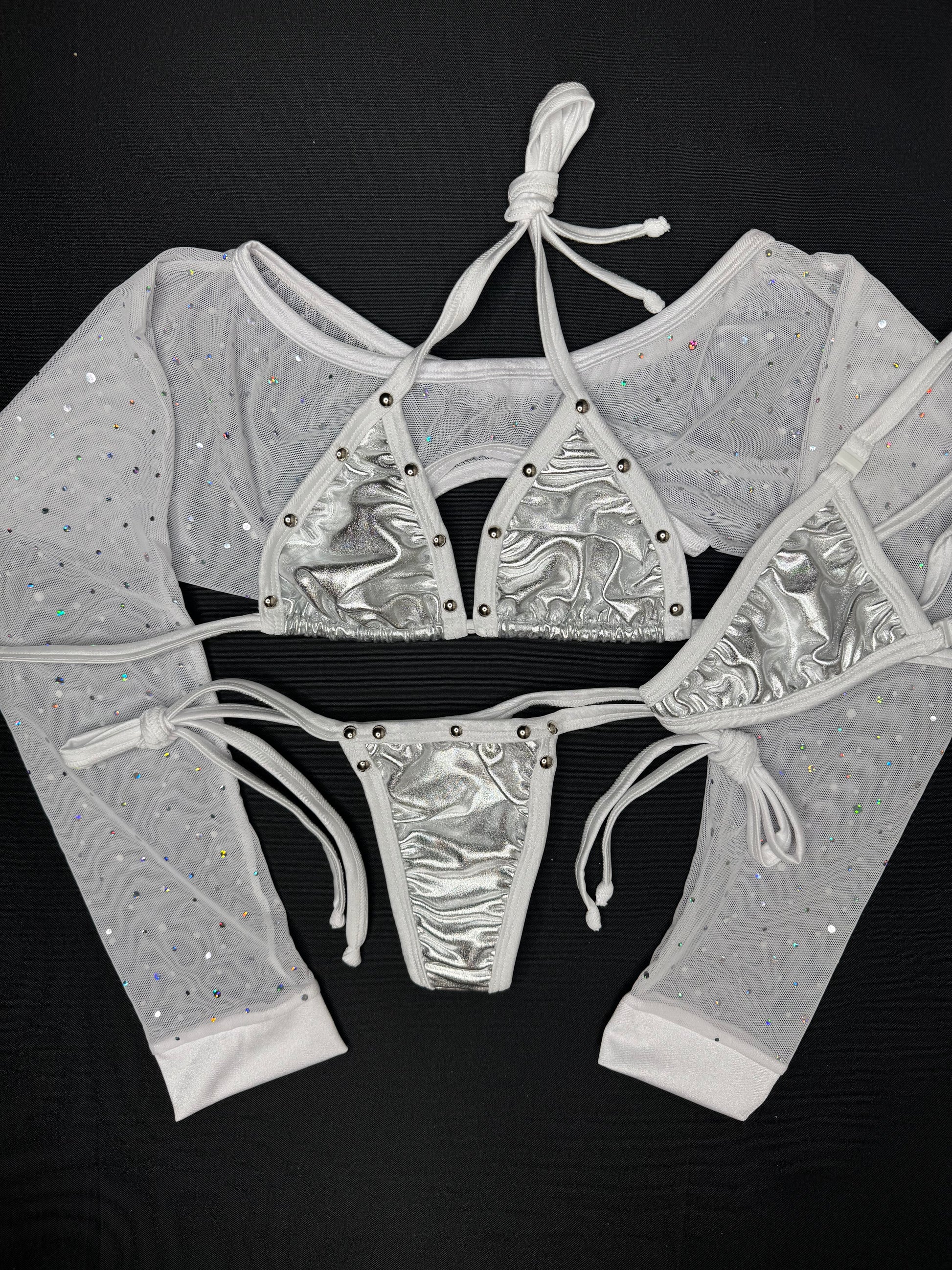 Chrome Spandex/White Mesh Three-Piece Lingerie Outfit