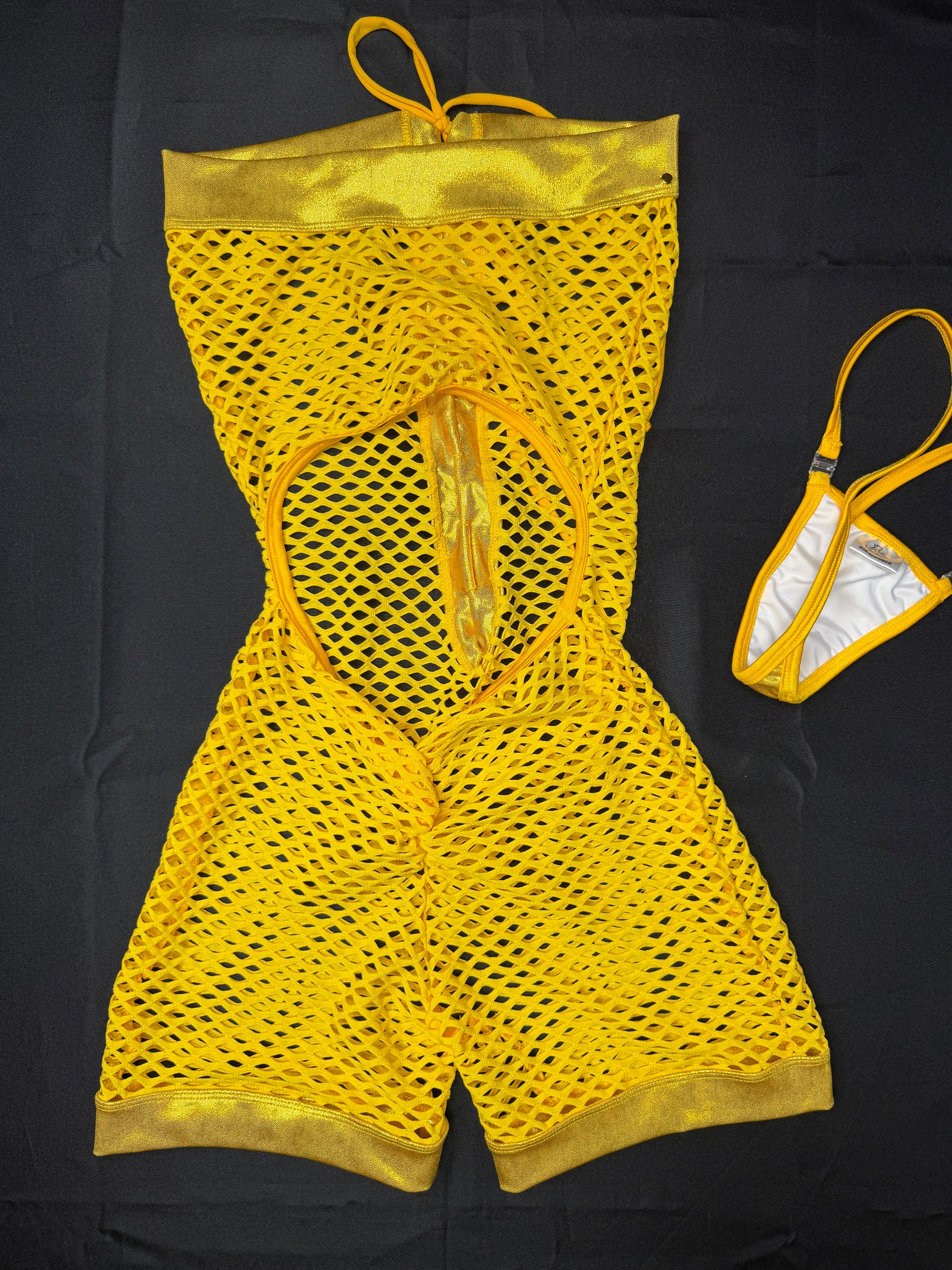 Daffodil Yellow Fishnet/Metallic Yellow Spandex One-Piece Lingerie Outfit