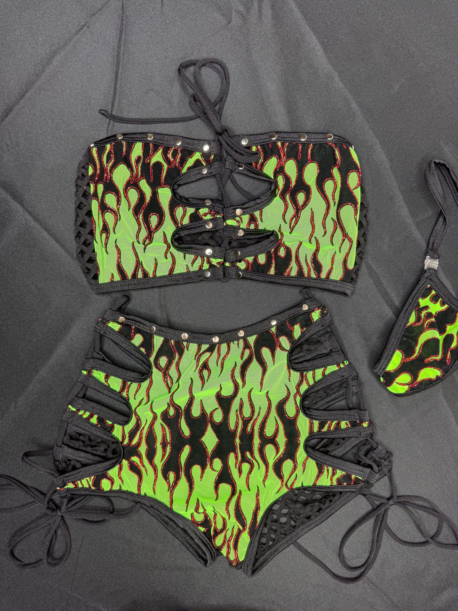 Green Fire Mesh/Black Fishnet Two-Piece Tube Top/Shorts Lingerie Outfit