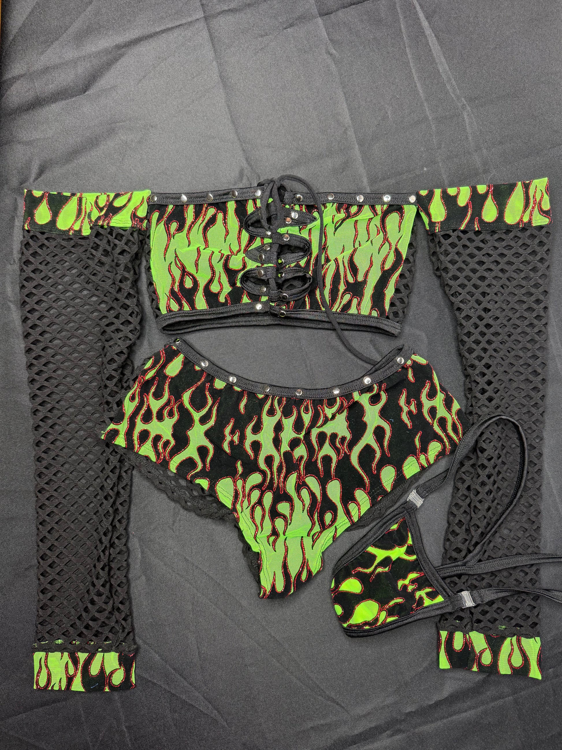 Green Flame Mesh Long Sleeve Tube Top/Shorts Two-Piece Lingerie Outfit