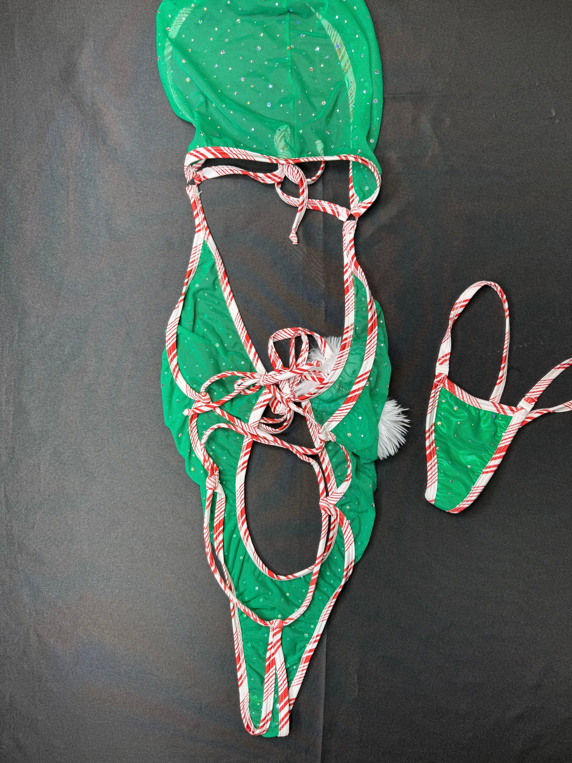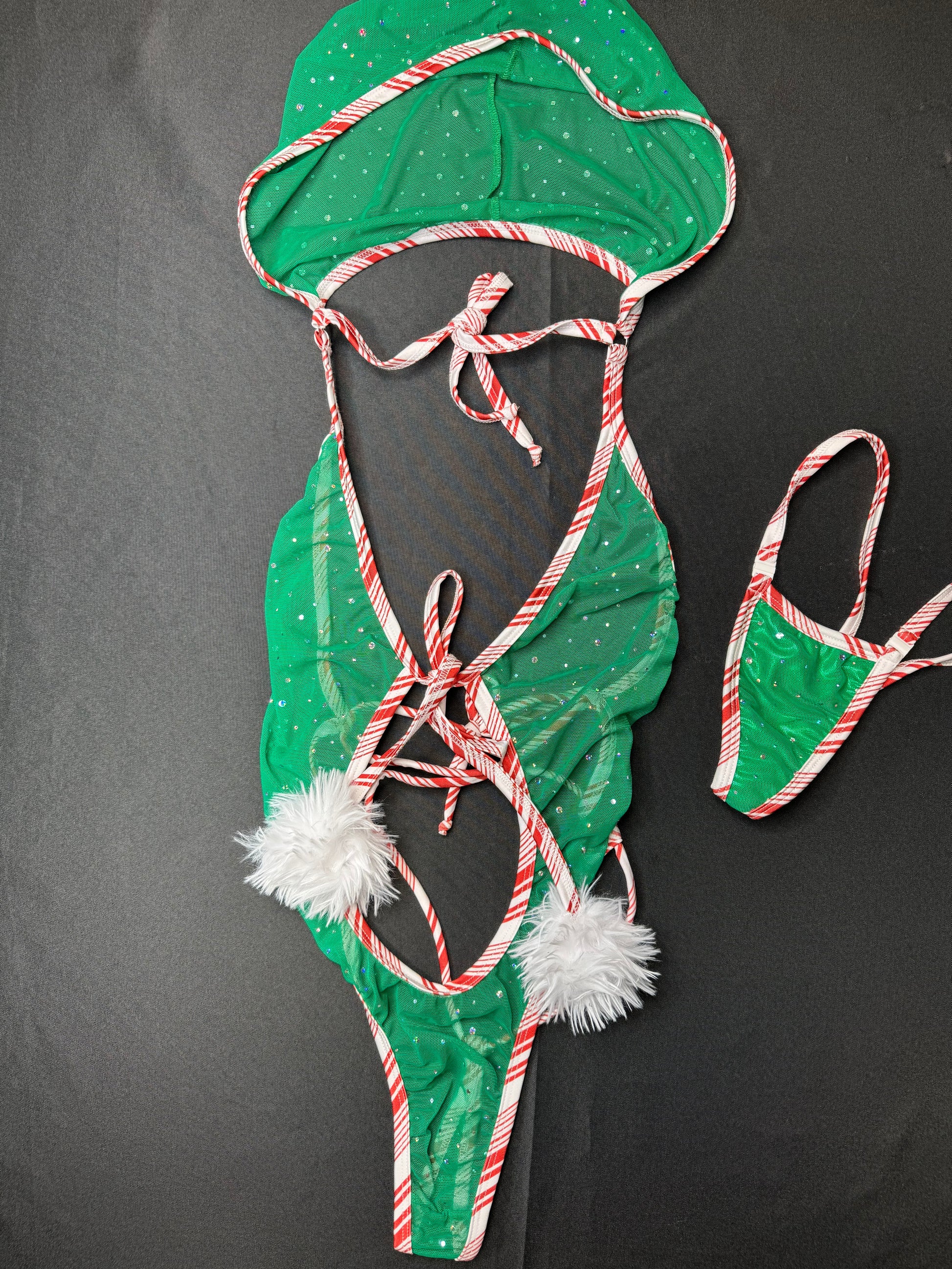 Green Sparkle Mesh/Candy Cane Hoodie One-Piece Lingerie Outfit