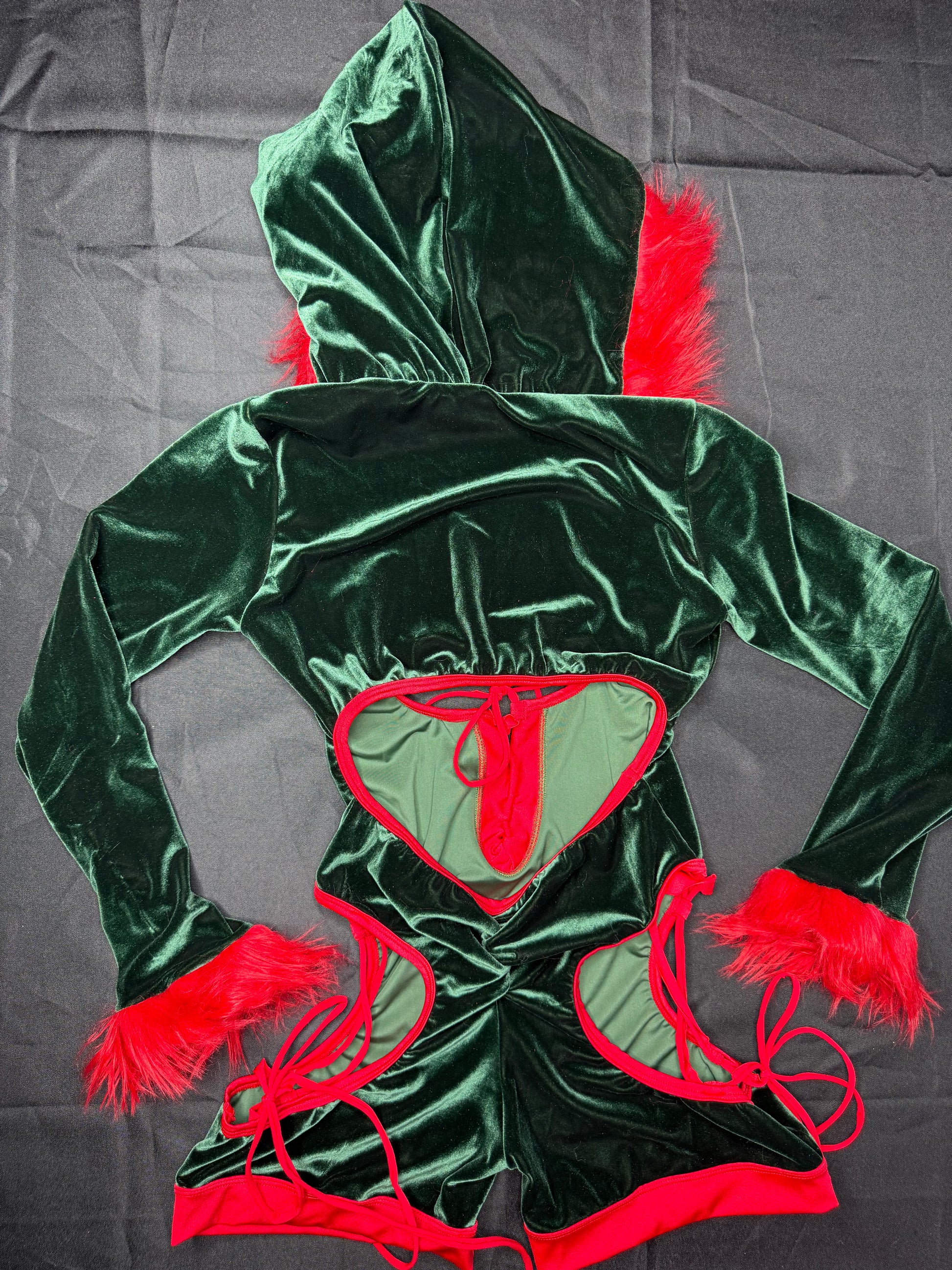 Green Velvet/Red Fur Hoodie Romper Christmas Lingerie Outfit
