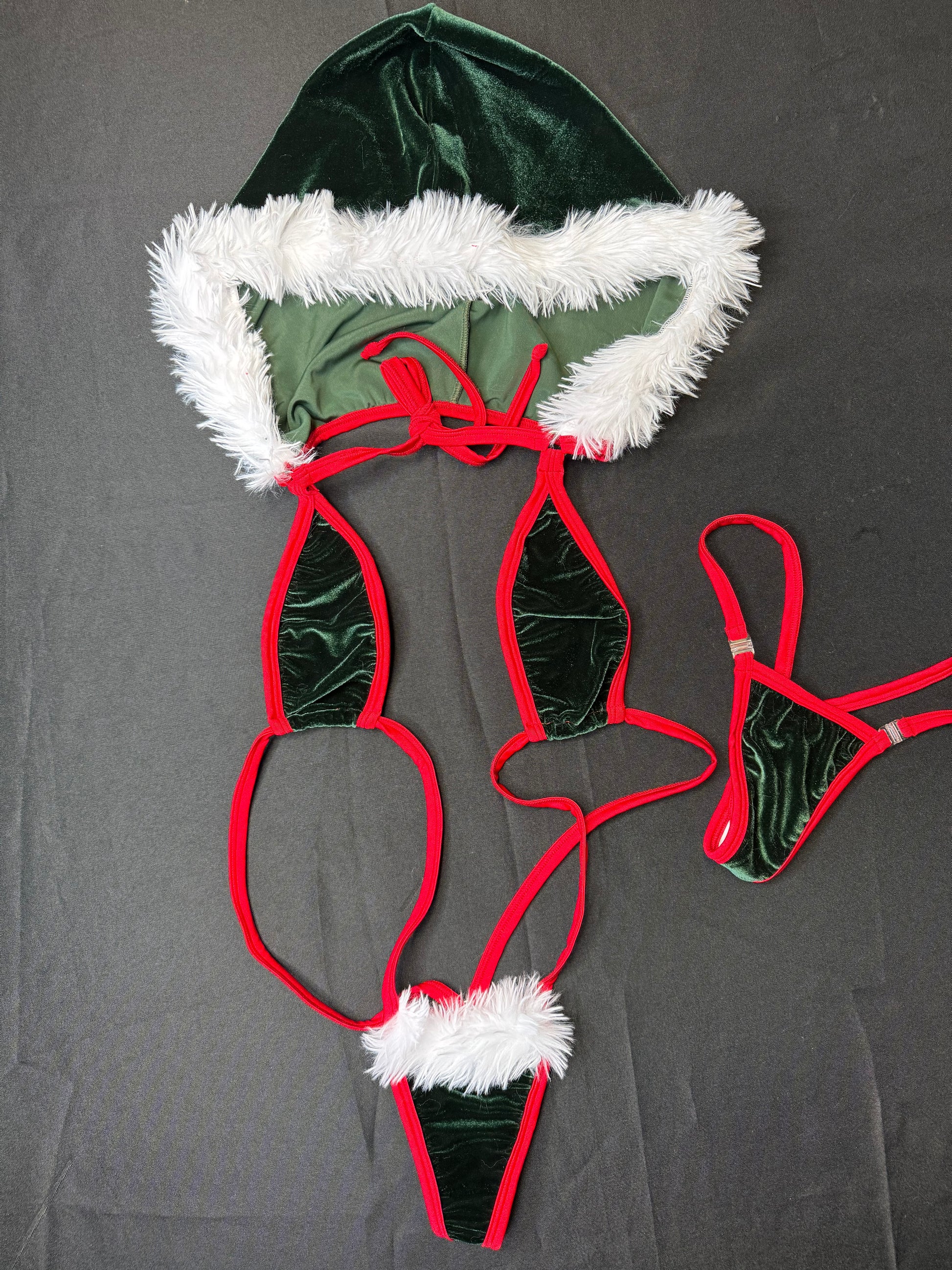 Green Velvet Sling-Shot Hoodie One-Piece Lingerie Outfit