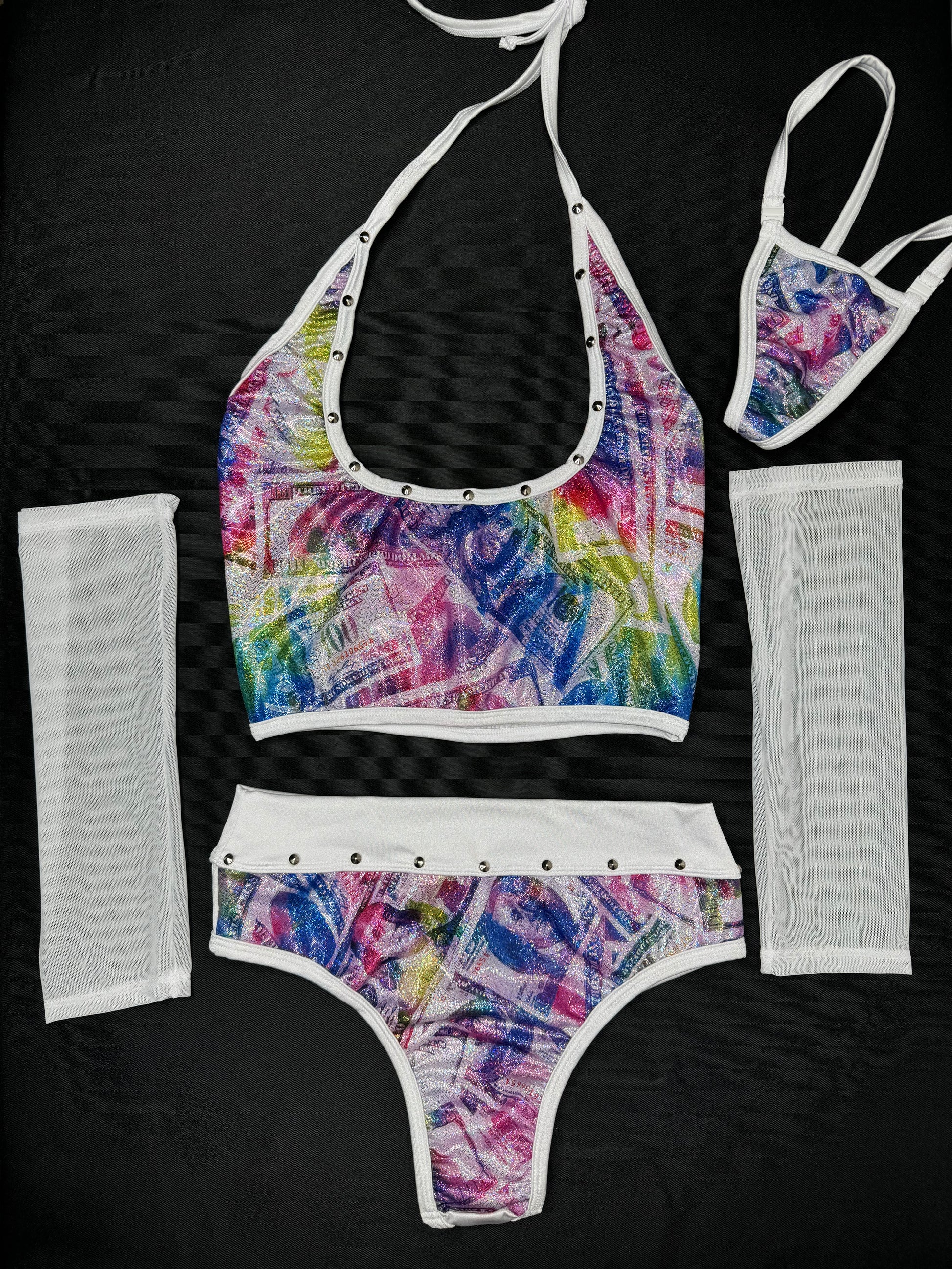 Holographic Money Print Three-Piece Lingerie Outfit