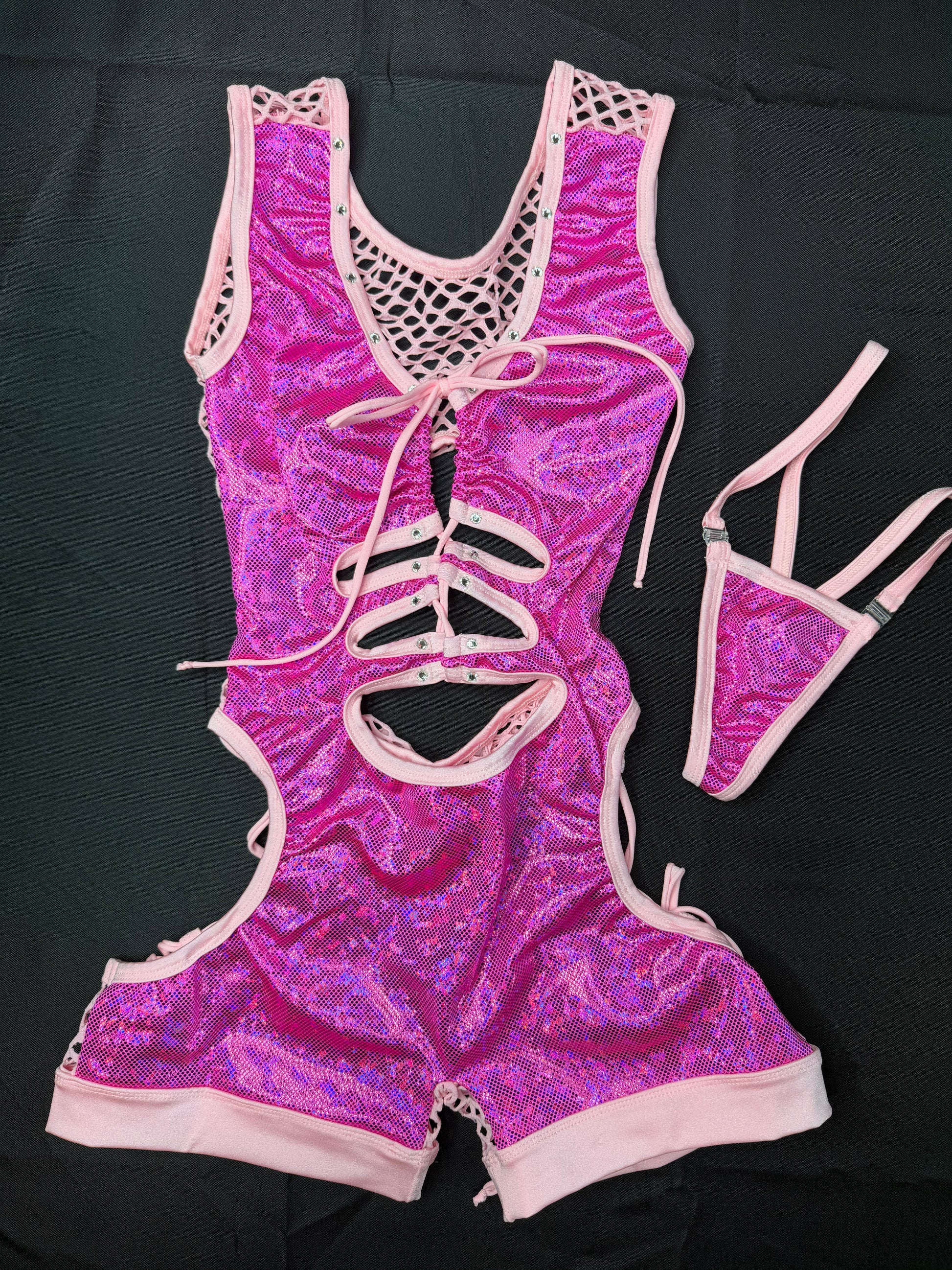 Hot Pink Metallic Spandex/Baby Pink Fishnet Romper Lingerie Outfit