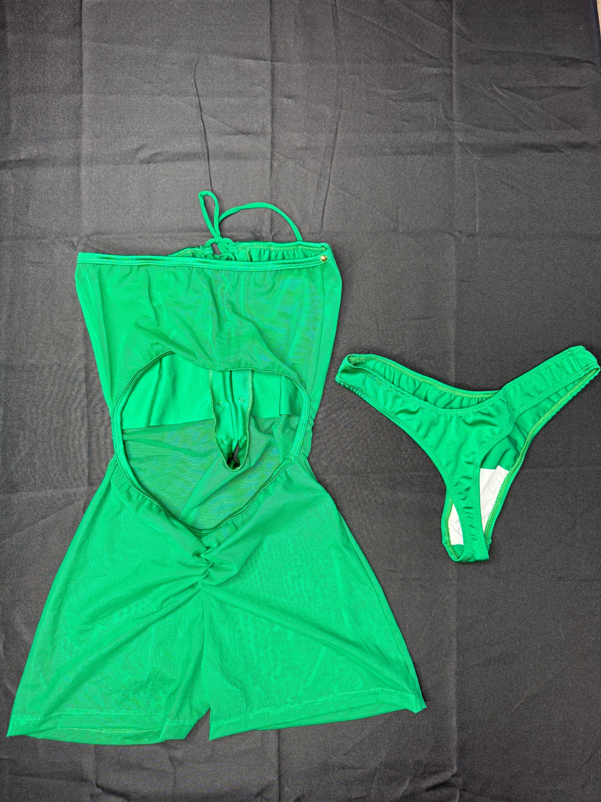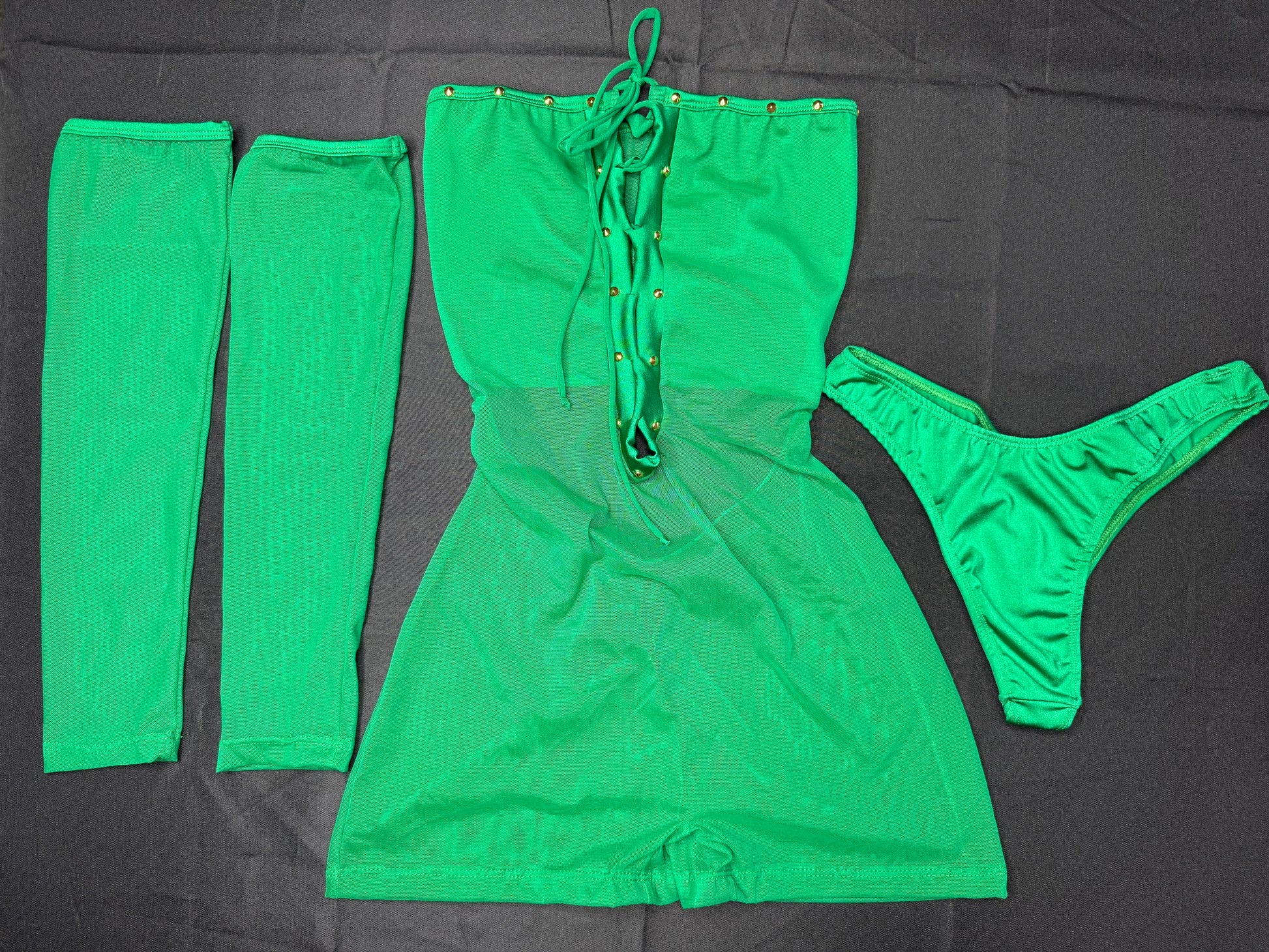 Hunter Green Three-Piece Sleeves/Cheeky Thong Lingerie Outfit