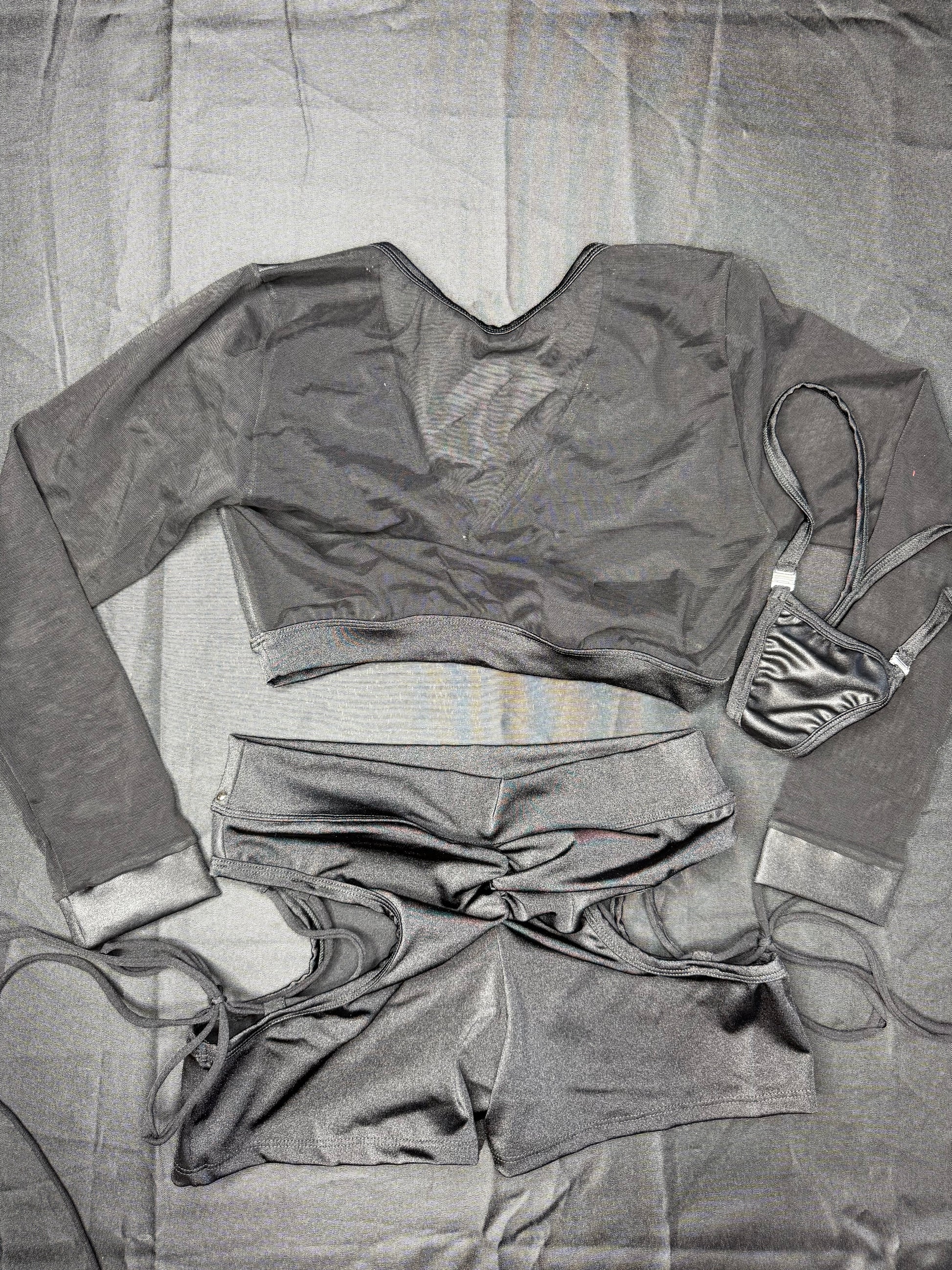 Matte Black Spandex/Black Mesh Long Sleeve Two-Piece Shorts Lingerie Outfit