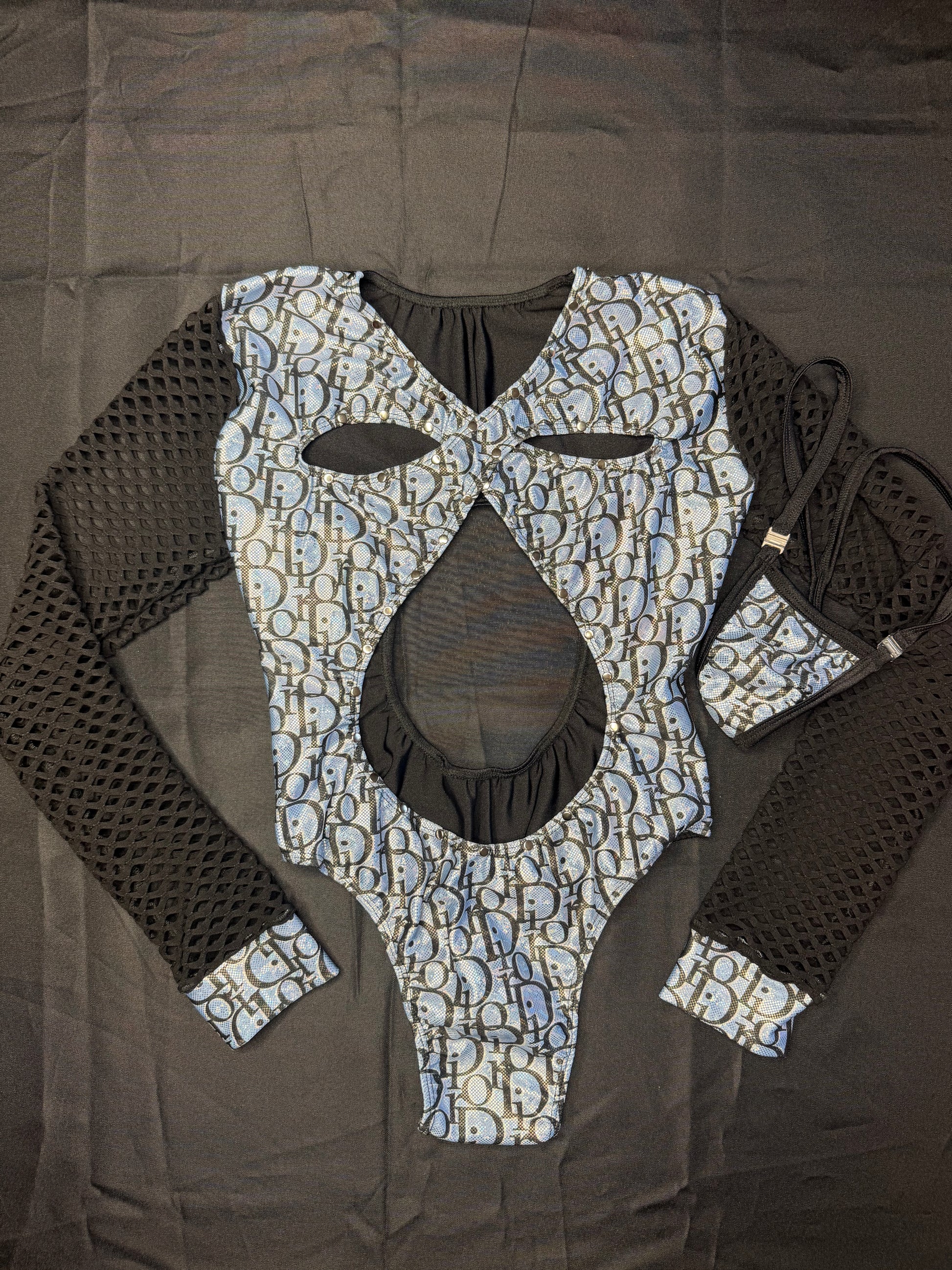 Metallic Baby Blue/Black Fishnet Long Sleeve Leotard Lingerie Outfit