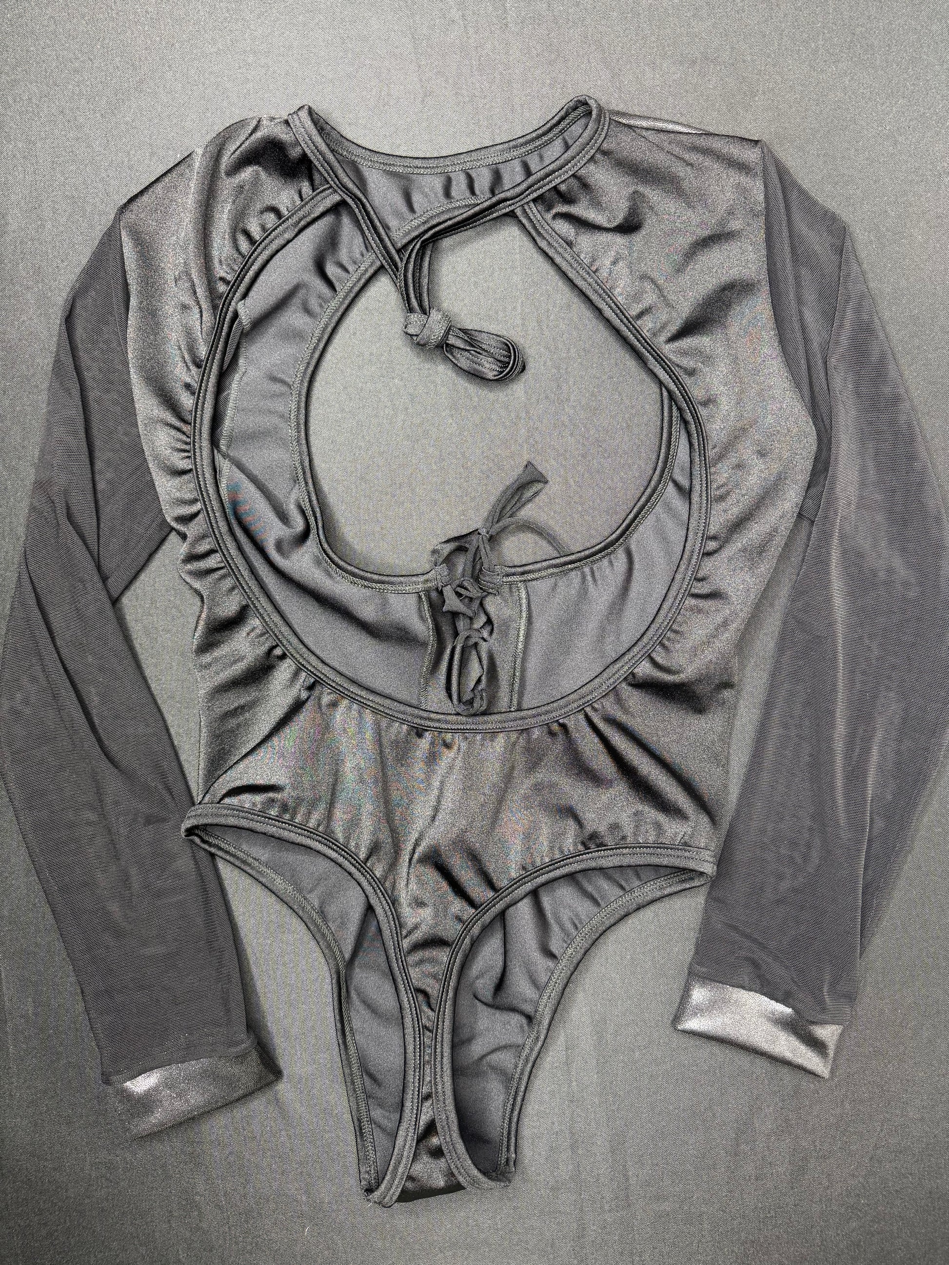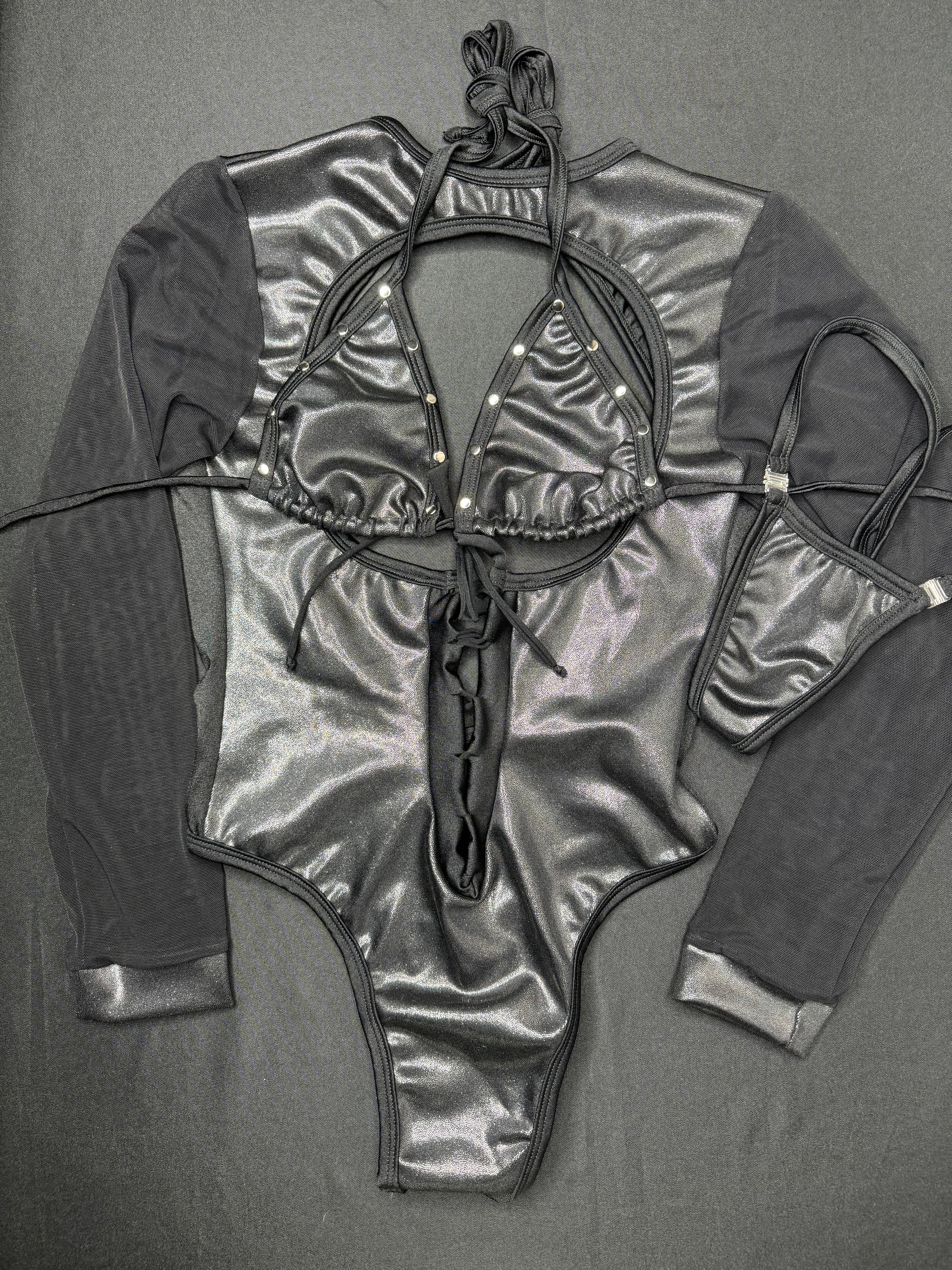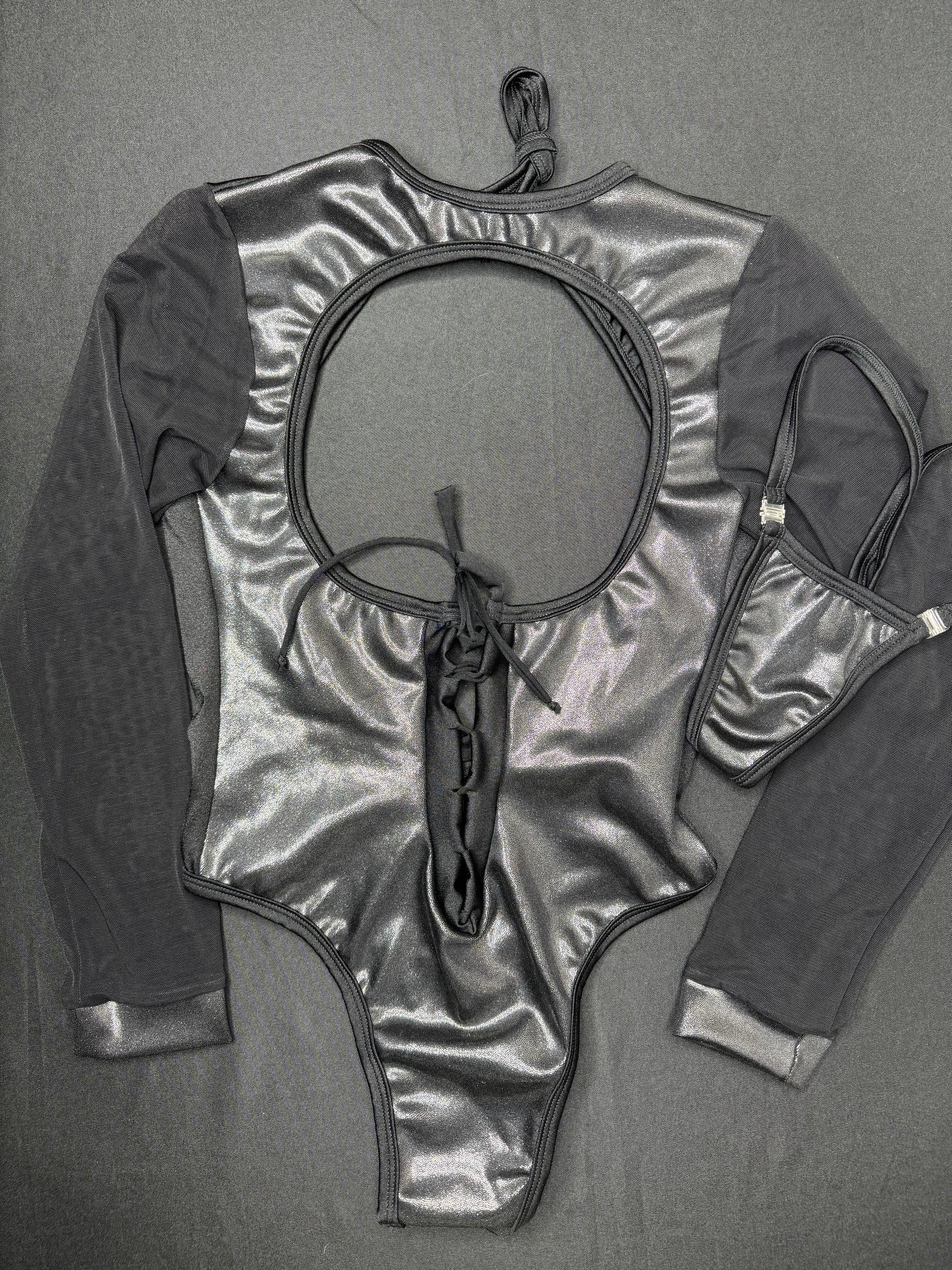Metallic Black/Black Mesh One-Piece Leotard Lingerie Outfit