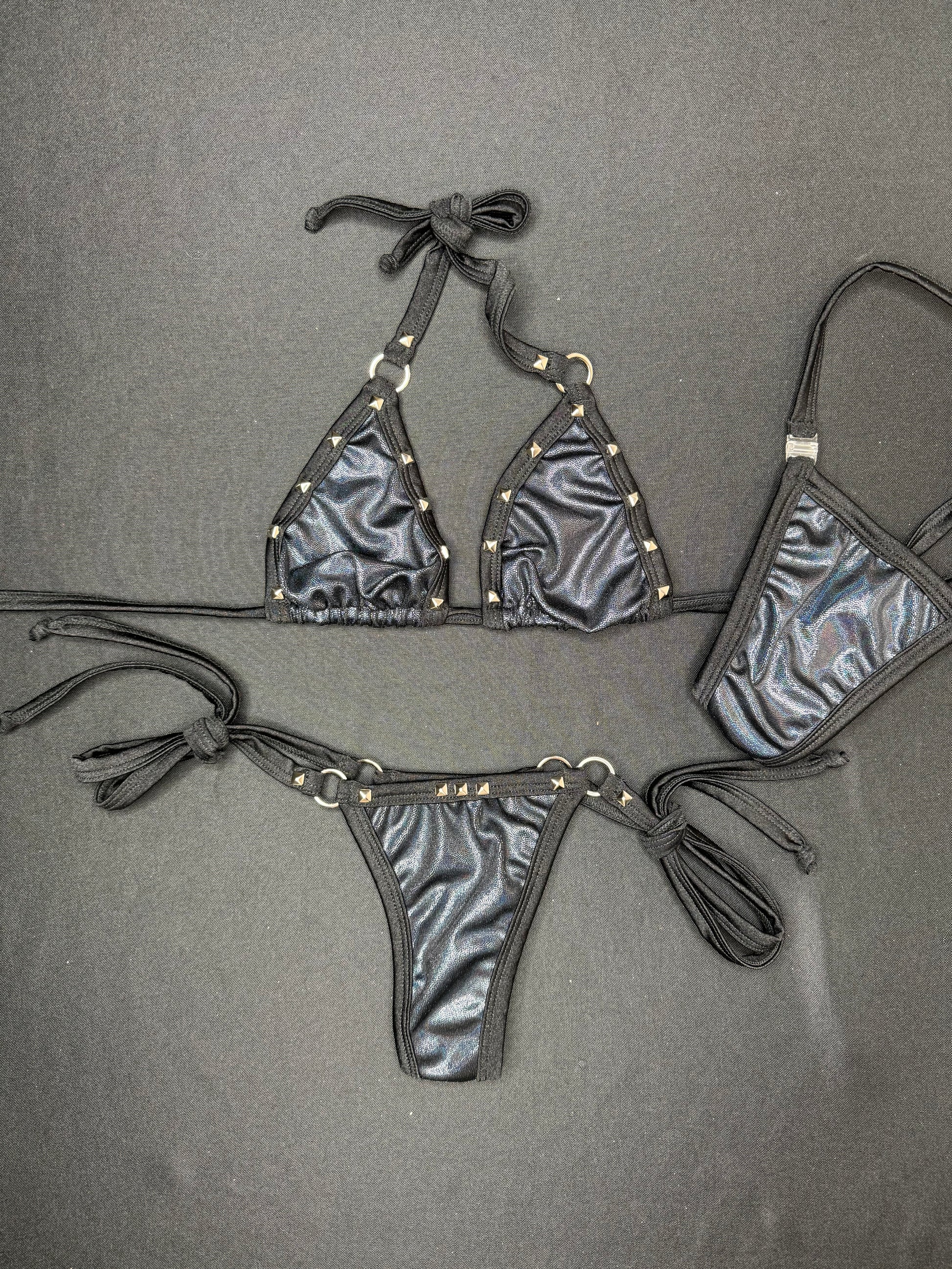 Metallic Black/Black Two-Piece Bikini Lingerie Outfit