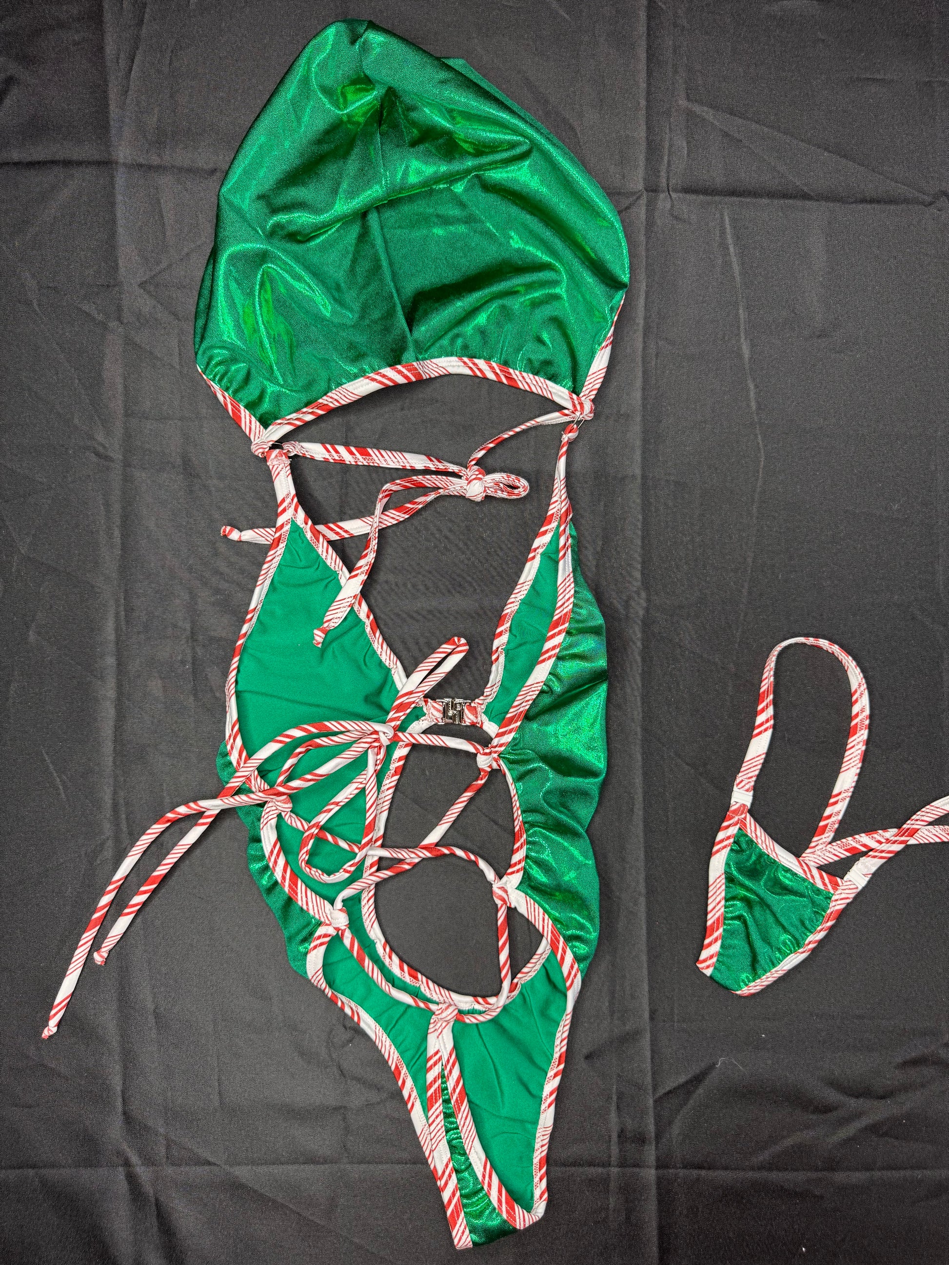 Metallic Green Spandex One-Piece Hoodie Christmas Lingerie Outfit