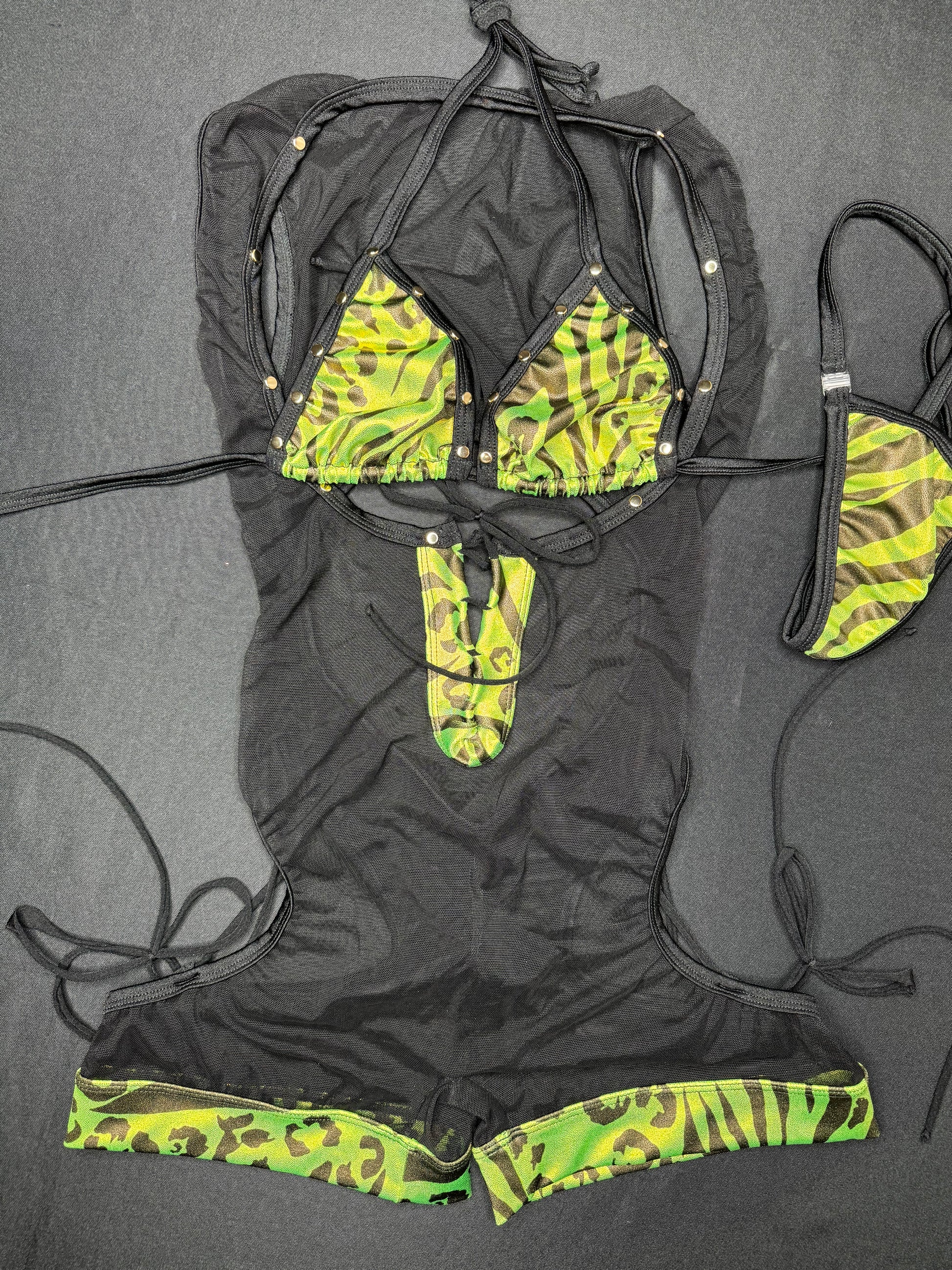 Metallic Green Tiger Stripe/Black Mesh Sleeveless Romper