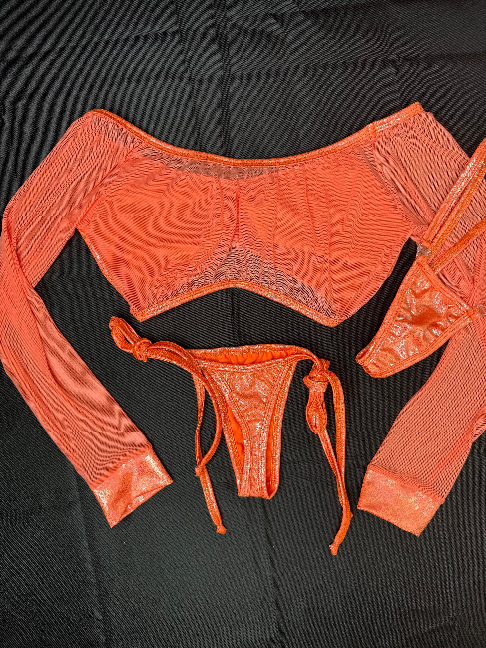 Metallic Orange Spandex/Orange Mesh Long Sleeve Two-Piece Lingerie Outfit