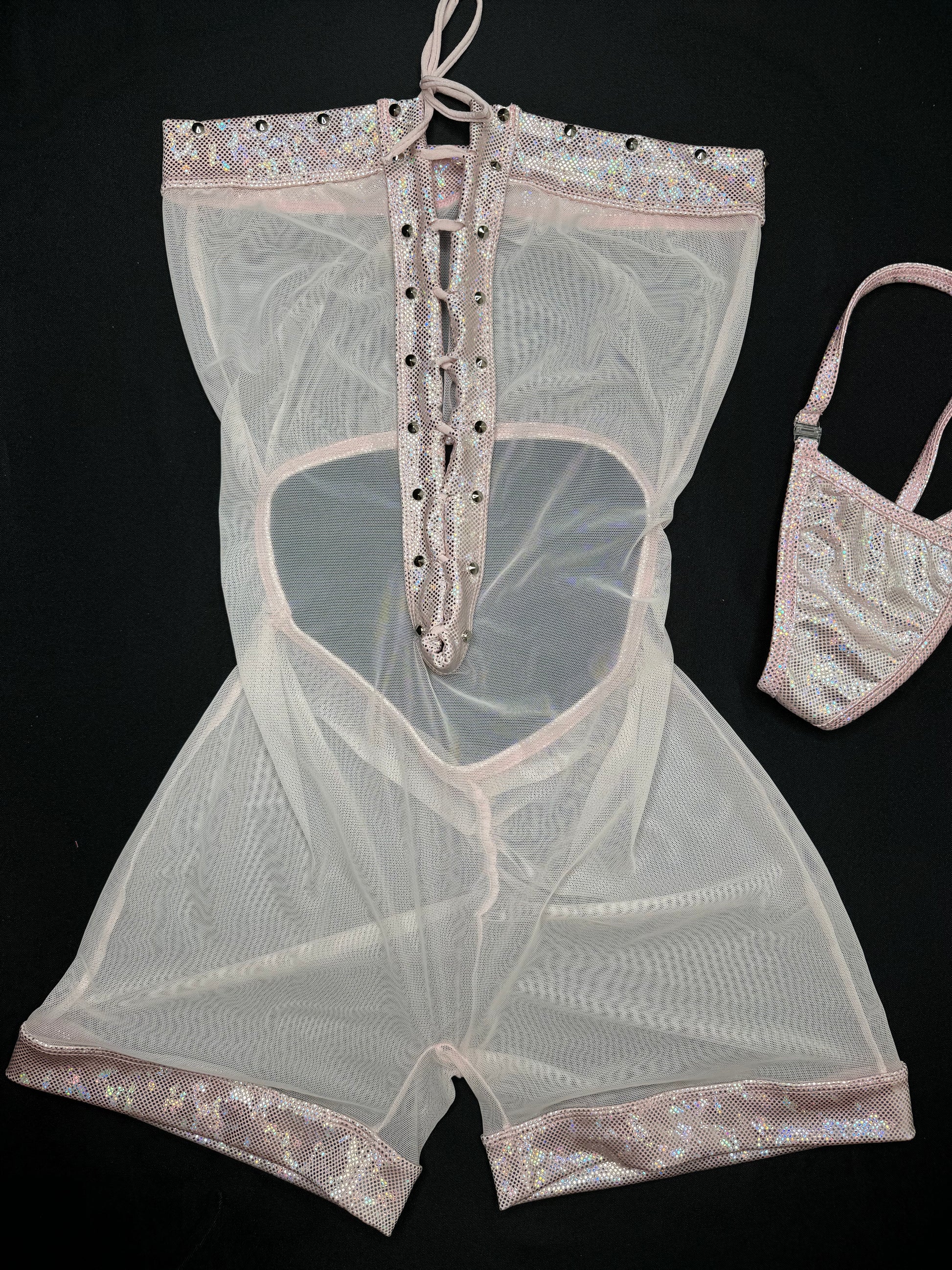 Metallic Pink/Pink Mesh One-Piece Lingerie Outfit