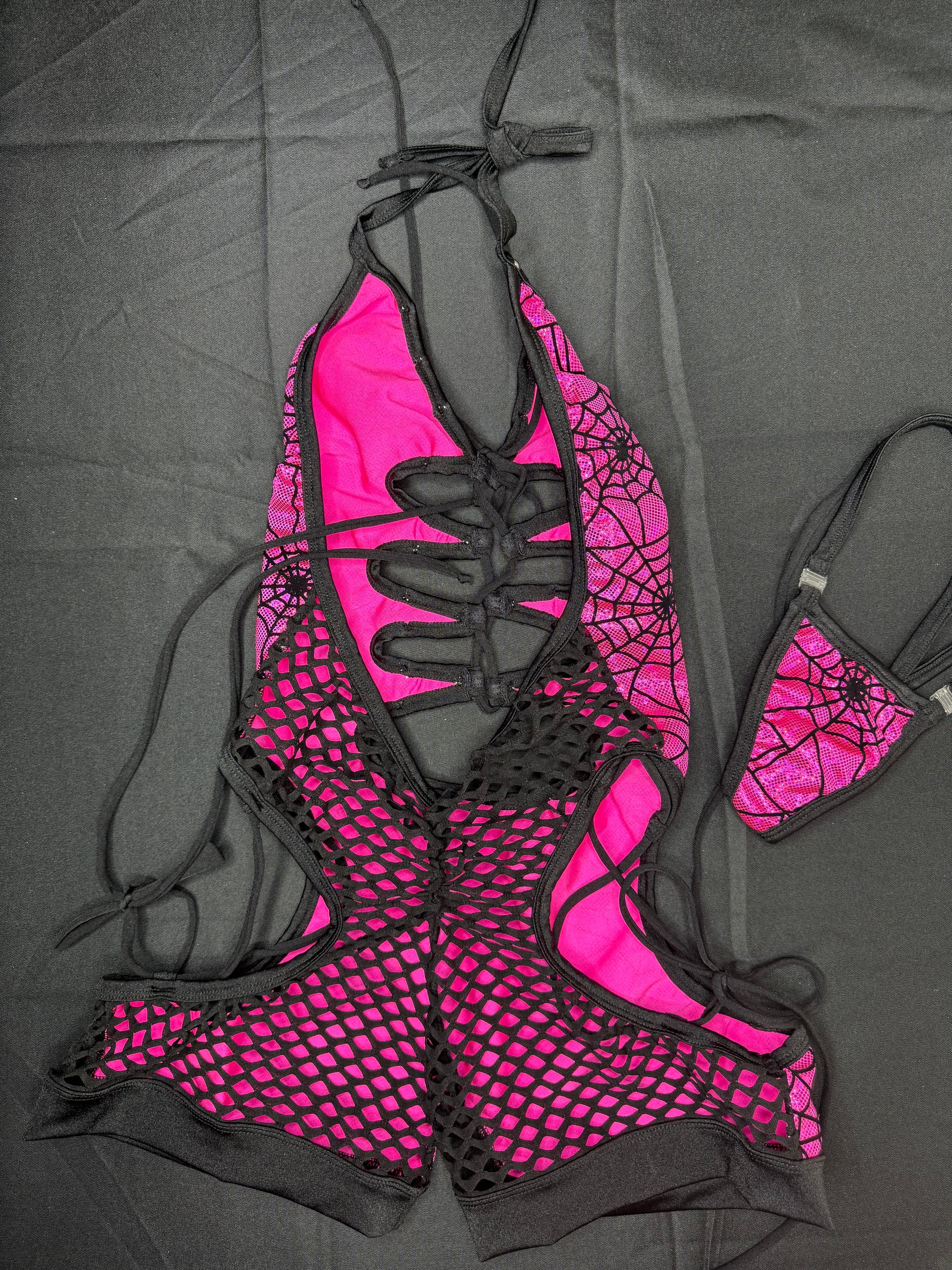 Metallic Pink Spider Web One-Piece Romper Lingerie